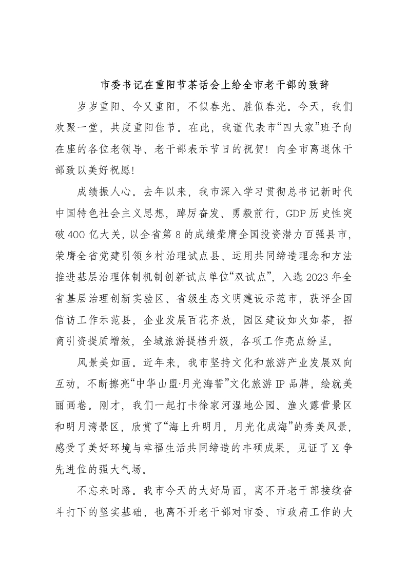 市委书记在重阳节茶话会上给全市老干部的致辞岁岁重阳、今又重阳,不似春光、胜似春光。今天,我们欢聚一堂,共度重阳佳节。在此,我谨代表市“四大家”班子向在座的各位老领导、老干部表示节日的祝贺!向全市离退休干部致以美好祝愿!成绩振人心。去年以来,我市深入学习贯彻总书记新时代中国特色社会主义思想,踔厉奋发、勇毅前行,GDP历史性突破400亿大关,以全省第8的成绩荣膺全国投资潜力百强县市,荣膺全省党建引领乡村治理试点县、运用共同缔造理念和方法推进基层治理体制机制创新试点单位“双试点”,入选2023年全省基层治理创新实验区、省级生态文明建设示范市,获评全国信访工作示范县,企业发展百花齐放,园区建设如火如茶,招商引资提质增效,全域旅游提档升级,各项工作亮点纷呈。风景美如画。近年来,我市坚持文化和旅游产业发展双向互动,不断擦亮“中华山盟·月光海誓”文化旅游P品牌,绘就美丽画卷。刚才,我们一起打卡徐家河湿地公园、渔火露营景区和明月湾景区,欣赏了“海上升明月,月光化成海”的秀美风景,感受了美好环境与幸福生活共同缔造的丰硕成果,见证了X争先进位的强大气场。不忘来时路。我市今天的大好局面,离不开老干部接续奋斗打下的坚实基础,也离不开老干部对市委、市政府工作的大力支持。在此,我向长期以来关心支持X发展的各位老领导、老同志表示衷心感谢,感谢你们对全市人民的浓浓情意,感谢你们对全市发展的默默奉献。继往开来,砥砺前行。全市的明天,离不开老干部的支持,离不开老干部的智慧,也离不开老干部的参与。希望大家积极弘扬“忠诚担当、追求卓越”的X精神,退休不褪色,离岗不离党,继续发挥政治强、觉悟高、党性好的优势,为谱写现代化建设新篇章提出宝贵意见,贡献智慧力量。敬老方有终。我们将认真执行党的老干部政策,将政治上尊重、思想上关心、生活上照顾、精神上关怀的要求落到实处,深怀敬老之情、恪尽为老之责,多办利老之事,让每一名老同志都更加深切地感受到党的温暖和关怀,让每一名老干部都能安度晚年!最后,再次祝各位老干部、老同志,节日快乐、健康长寿、万事如意!