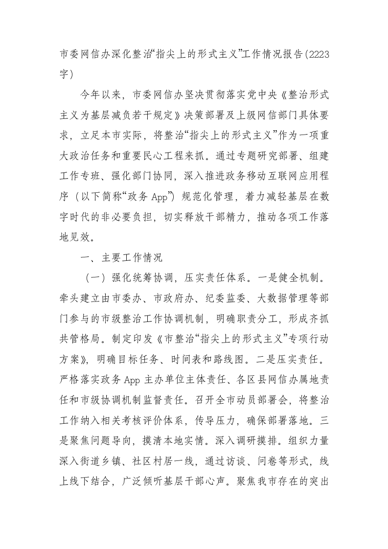 市委网信办深化整治“指尖上的形式主义”工作情况报告(2223字)今年以来,市委网信办坚决贯彻落实党中央《整治形式主义为基层减负若干规定》决策部署及上级网信部门具体要求,立足本市实际,将整治“指尖上的形式主义”作为一项重大政治任务和重要民心工程来抓。通过专题研究部署、组建工作专班、强化部门协同,深入推进政务移动互联网应用程序(以下简称“政务App”规范化管理,着力减轻基层在数字时代的非必要负担,切实释放干部精力,推动各项工作落地见效。一、主要工作情况(一)强化统筹协调,压实责任体系。一是健全机制。牵头建立由市委办、市政府办、纪委监委、大数据管理等部门参与的市级整治工作协调机制,明确职责分工,形成齐抓共管格局。制定印发《市整治“指尖上的形式主义”专项行动方案》,明确目标任务、时间表和路线图。二是压实责任。严格落实政务APp主办单位主体责任、各区县网信办属地责任和市级协调机制监督责任。召开全市动员部署会,将整治工作纳入相关考核评价体系,传导压力,确保部署落地。三是聚焦问题导向,摸清本地实情。深入调研摸排。组织力量深入街道乡镇、社区村居一线,通过访谈、问卷等形式,线上线下结合,广泛倾听基层干部心声。聚焦我市存在的突出问题,如政务APp数量过多过滥、功能重复交叉、强制打卡签到、积分排名评比、数据多头填报、过度留痕、操作繁琐等,建立问题清单台账。(二)加强能力建设,精准分类施策。一是深化培训指导。举办市级层面“指尖减负”专题培训班及政务App管理规范研讨会,覆盖各区县网信办负责同志及重点市直单位管理员。编制印发《市政务APp常见问题防治指南》,动态更新,提供清晰操作指引。二是杜绝“一刀切”强调因地制宜、分类处置原则。指导各地区各部门对照标准,对存量App进行全面自查评估。区分情况采取“关停注销一批、整合迁移一批、规范提升一批”的策略,避免简单化处理和“以形式主义反形式主义”三是是试点探索先行。选取我市具有代表性的4个区(县)作为市级试点单位,指导其围绕“精简整合、规范管理、效能提升”开展探索,形成可复制推广的本地经验。x区率先完成7大类App整合,x县建立准入审核负面清单(三)发挥技术优势,提升监管效能。一是建设监管平台。依托我市网信技术力量,开发上线“市政务App规范化管理平台”。该平台具备备案登记、在线检测、问题反馈、数据分析、整改跟踪等功能,实现对全市纳入管理范围的政务App“一平台统管”二是强化技术检测。运用自动化检测工具与人工核查相结合方式,重点检测打卡、排名、时长统计等强制使用功能、缺漏必要功能、性能不稳定、数据安全风险、