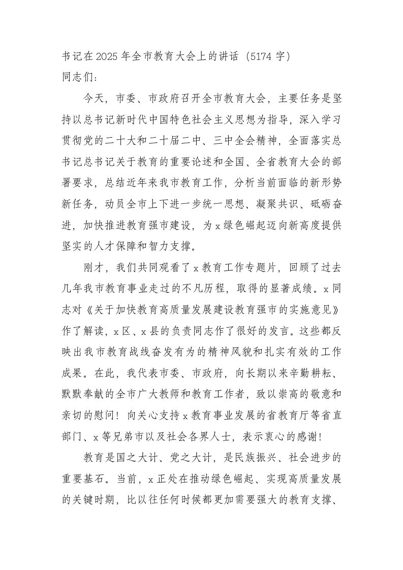 书记在2025年全市教育大会上的讲话(5174字)同志们:今天,市委、市政府召开全市教育大会,主要任务是坚持以总书记新时代中国特色社会主义思想为指导,深入学习贯彻党的二十大和二十届二中、三中全会精神,全面落实总书记总书记关于教育的重要论述和全国、全省教育大会的部署要求,总结近年来我市教育工作,分析当前面临的新形势新任务,动员全市上下进一步统一思想、凝聚共识、砥砺奋进,加快推进教育强市建设,为x绿色崛起迈向新高度提供坚实的人才保障和智力支撑。刚才,我们共同观看了x教育工作专题片,回顾了过去几年我市教育事业走过的不凡历程,取得的显著成绩。x同志对《关于加快教育高质量发展建设教育强市的实施意见》作了解读,x区、x县的负责同志作了很好的发言。这些都反映出我市教育战线奋发有为的精神风貌和扎实有效的工作成果。在此,我代表市委、市政府,向长期以来辛勤耕耘、默默奉献的全市广大教师和教育工作者,致以崇高的敬意和亲切的慰问!向关心支持x教育事业发展的省教育厅等省直部门、x等兄弟市以及社会各界人士,表示衷心的感谢!教育是国之大计、党之大计,是民族振兴、社会进步的重要基石。当前,x正处在推动绿色崛起、实现高质量发展的关键时期,比以往任何时候都更加需要强大的教育支撑、更加渴求高素质的人才。我们必须从战略和全局的高度,深刻认识加快推进教育现代化的极端重要性和现实紧迫性。全市上下要切实把思想和行动统一到党中央和省委的决策部署上来,坚持从政治上看教育、从民生上抓教育、从规律上办教育,以高度的责任感和使命感,奋力开创我市教育事业发展新局面。下面,我讲四点意见。一、深刻把握教育的政治属性,在坚定正确方向中铸魂育人教育的首要问题,是培养什么人、怎样培养人、为谁培养人。这个方向问题必须旗帜鲜明、毫不含糊。要始终坚持党对教育事业的全面领导,将立德树人作为根本任务,确保教育事业始终沿着正确的政治方向前进,以实际行动坚定拥护“两个确立”、坚决做到“两个维护”(一)必须把稳思想之舵,巩固理想信念根基。育人的根本在于立德。要坚持不懈用总书记新时代中国特色社会主义思想铸魂育人,持续推动党的创新理论进教材、进课堂、进头脑。要守正创新推动思政课建设内涵式发展,着力打造一批精品课程和优秀教师团队,把道理讲深、讲透、讲活,让学生真学、真懂、真信、真用。要推动思政小课堂与社会大课堂的深度融合,善于把“x革命老区”这一最宝贵的红色资源,转化为铸魂育人的生动教材,组织广大青少年走进革命旧址、走进田间地头、走进工厂车间,在亲身实践中感悟