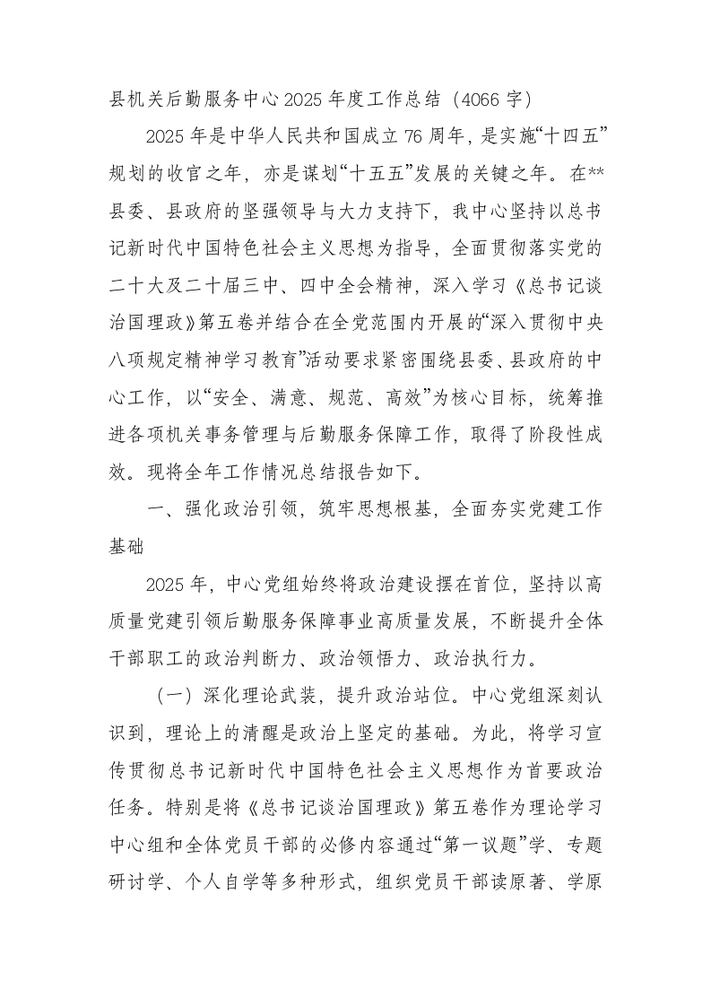 县机关后勤服务中心2025年度工作总结(4066字)2025年是中华人民共和国成立76周年,是实施“十四五”规划的收官之年,亦是谋划“十五五”发展的关键之年。在*县委、县政府的坚强领导与大力支持下,我中心坚持以总书记新时代中国特色社会主义思想为指导,全面贯彻落实党的二十大及二十届三中、四中全会精神,深入学习《总书记谈治国理政》第五卷并结合在全党范围内开展的“深入贯彻中央八项规定精神学习教育”活动要求紧密围绕县委、县政府的中心工作,以“安全、满意、规范、高效”为核心目标,统筹推进各项机关事务管理与后勤服务保障工作,取得了阶段性成效。现将全年工作情况总结报告如下。一、强化政治引领,筑牢思想根基,全面夯实党建工作基础2025年,中心党组始终将政治建设摆在首位,坚持以高质量党建引领后勤服务保障事业高质量发展,不断提升全体干部职工的政治判断力、政治领悟力、政治执行力。(一)深化理论武装,提升政治站位。中心党组深刻认识到,理论上的清醒是政治上坚定的基础。为此,将学习宣传贯彻总书记新时代中国特色社会主义思想作为首要政治任务。特别是将《总书记谈治国理政》第五卷作为理论学习中心组和全体党员干部的必修内容通过“第一议题”学、专题研讨学、个人自学等多种形式,组织党员干部读原著、学原文、悟原理,深刻领会其中蕴含的马克思主义立场观点方法,以及对中国式现代化建设的深邃思考。同时,及时跟进学习党的二十届四中全会精神,准确把握党中央对当前国内外形势的科学判断和对未来发展的战略部署确保中心各项工作始终与党中央决策部署同频共振。全年累计召开党组理论学习中心组学习会12次,党员大会5次,支部委员会12次,组织主题党日活动10次,支部书记讲授专题党课4次。通过“学习强国”“*先锋”等线上平台,构建起线上线下相结合、个人自学与集中学习互为补充的常态化学习机制,有效激发了党员干部理论学习的内生动力。(二)压实党建责任,夯实组织基础。严格落实全面从严治党主体责任,坚持党建工作与业务工作同谋划、同部署、同考核,形成党组书记作为“第一责任人”亲自抓、班子成员履行“一岗双责”协同抓的工作格局。高质量执行“三会一课”、民主评议党员、谈心谈话等党内政治生活制度,全年与党员干部开展谈心谈话累计超过30人次,及时掌握思想动态,有效增强了党组织的凝聚力和战斗力。同时,不断创新党建活动载体,结合后勤服务工作实际,组织开展了“机关党旗红垃圾分类,从我做起”“民族团结一家亲”等特色主题党日活动,引导党员在服务中心工作、参与社会治理、促进民族团结中发挥先锋模范作用,推动党建与业务深度融合、互促共进。