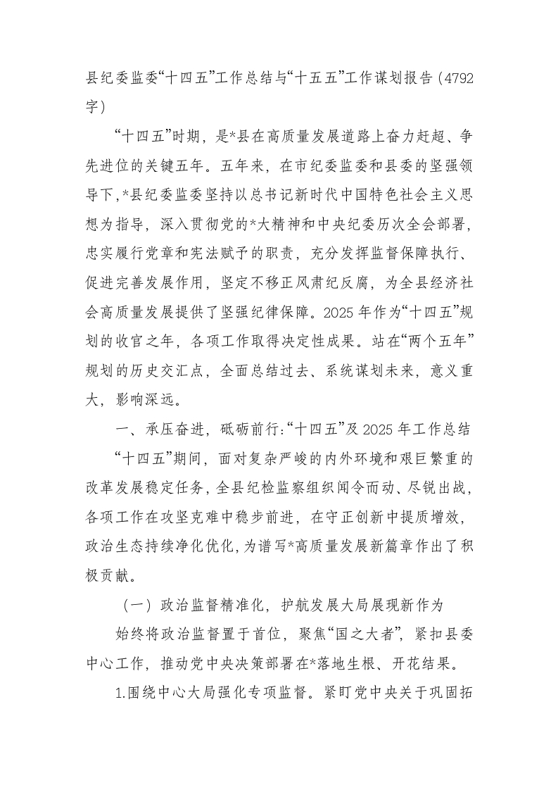 县纪委监委“十四五”工作总结与“十五五”工作谋划报告(4792字)“十四五”时期,是*县在高质量发展道路上奋力赶超、争先进位的关键五年。五年来,在市纪委监委和县委的坚强领导下,*县纪委监委坚持以总书记新时代中国特色社会主义思想为指导,深入贯彻党的*大精神和中央纪委历次全会部署,忠实履行党章和宪法赋予的职责,充分发挥监督保障执行、促进完善发展作用,坚定不移正风肃纪反腐,为全县经济社会高质量发展提供了坚强纪律保障。2025年作为“十四五”规划的收官之年,各项工作取得决定性成果。站在“两个五年”规划的历史交汇点,全面总结过去、系统谋未来,意义重大,影响深远。一、承压奋进,砥砺前行:“十四五”及2025年工作总结“十四五”期间,面对复杂严峻的内外环境和艰巨繁重的改革发展稳定任务,全县纪检监察组织闻令而动、尽锐出战,各项工作在攻坚克难中稳步前进,在守正创新中提质增效,政治生态持续净化优化,为谱写*高质量发展新篇章作出了积极贡献。(一)政治监督精准化,护航发展大局展现新作为始终将政治监督置于首位,聚焦“国之大者”,紧扣县委中心工作,推动党中央决策部署在*落地生根、开花结果。1.围绕中心大局强化专项监督。紧盯党中央关于巩固拓展脱贫攻坚成果同乡村振兴有效衔接、生态文明建设、粮食安全等重大决策部署,建立“室组地”联动监督机制,开展靶向监督。例如,针对中央环保督察反馈的*区域矿山生态修复问题,我委迅速跟进,对相关职能部门履职情况开展专项督查,推动问题整改到位。在“十四五”期间,围绕全县“3+1”重点项目等中心工作,开展“突击战”式监督,确保政令畅通、令行禁止。据统计,五年间共开展重点领域专项监督18轮次,发现并推动整改问题450余个,提出监察建议60余份,确保了县委县政府重大项目和重点工作顺利推进。2.聚焦营商环境实施护航监督。深刻认识到营商环境就是生产力、竞争力,持续深化营商环境突出问题专项整治。建立纪企“直通车”制度,公开受理企业和群众反映的干部不作为、慢作为、乱作为问题线索。“十四五”期间,共受理相关问题线索280余件,查处损害营商环境典型案件58件,处理75人,推动相关职能部门为企业减负、挽回经济损失约4500万元。通过严厉查处一批破坏营商环境的典型案例,释放了为担当者担当、为干事者撑腰的强烈信号,有效提振了市场主体信心。3.立足职能职责做实日常监督。将监督融入日常、抓在经常,通过参加或列席党委(党组)会议、开展谈心谈话、实地走访调研等方式,做实做细对“一把手”和领导班子的近距离监督。特别是在“十四五”前期的疫情防控大战大考中,