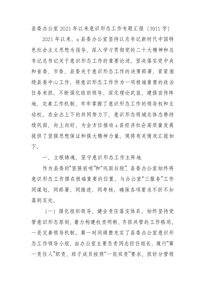 县委办公室2021年以来意识形态工作专题汇报(3911字)2021年以来,x县委办公室坚持以总书记新时代中国特色社会主义思想为指导,深入学习贯彻党的二十大精神和总书记总书记关于意识形态工作的重要论述,坚决落实党中央和省委、市委、县委关于意识形态工作的决策部署,紧紧围绕县委中心工作,将意识形态工作作为一项极端重要的政治任务来抓,不断强化组织领导、深化理论武装、建强宣传阵地、完善工作机制,牢牢掌握了意识形态工作的领导权和主动权。在全办上下的共同努力下,意识形态领域总体态势持续巩固、向上向好,为全方位推动x县经济社会高质量发展提供了坚强思想保证和强大精神力量。现将有关情况汇报如下。一、立根铸魂,坚守意识形态工作主阵地作为县委的“坚强前哨”和“巩固后院”县委办公室始终将意识形态工作摆在极端重要的位置,与办公室“三服务”工作同谋划、同部署、同推进、同考核,确保各项要求不折不扣落到实处。(一)强化组织领导,健全责任落实体系。始终坚持党管意识形态原则,着力构建权责明晰、齐抓共管的工作格局。一是完善领导机制。第一时间调整充实了县委办公室意识形态工作领导小组,由办公室主要负责同志担任组长,履行“第一责任人”职责,班子成员按照“一岗双责”要求,抓好分管领域的意识形态工作。坚持将意识形态工作纳入办公室年度工作要点、党的建设重要内容和政治建设考察范畴,形成了主要领导亲自抓、分管领导具体抓、各股室协同落实的责任链条。自2021年以来,累计召开12次室务会专题研究意识形态工作,定期听取情况汇报,分析研判形势,解决实际问题。二是压实主体责任。严格对标《党委(党组)意识形态工作责任制实施办法》及省市县相关文件要求,协助县委研究制定了加强全县党委(党组)意识形态工作的实施意见和责任制考核办法推动将意识形态工作纳入全县各级领导班子、领导干部目标管理和年度综合考核的重要内容并将考核结果作为干部评价使用、评先评优的重要依据,层层传导压力,确保责任落地生根。三是加强督导检查。结合县委开展的全县性意识形态工作专项督查,办公室内部也定期开展自查自纠,重点围绕政治方向、舆论导向、价值取向等方面进行审视和检讨。针对省委巡视反馈涉及意识形态领域的问题,办公室牵头制定整改方案,逐项明确整改措施、责任人和完成时限,确保问题整改清仓见底,建立长效机制。(二)深化理论武装,筑牢绝对忠诚思想根基。坚持把用党的创新理论武装头脑作为首要政治任务,持续在学懂弄通做实上下功夫,教育引导全办干部职工深刻领悟“两个确立”的决定性意义,增强“四个意识”、坚定“四个自信”、做到“两个维护”。一是抓实“第一议题”学习。严格落实“第一议题”制