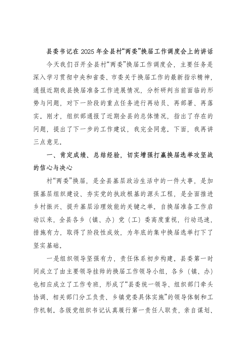 县委书记在2025年全县村“两委”换届工作调度会上的讲话今天我们召开全县村“两委”换届工作调度会,主要任务是深入学习贯彻中央和省委、市委关于换届工作的最新指示精神,通报近期我县换届准备工作进展情况,分析研判当前面临的形势与问题,对下一阶段的重点任务进行再动员、再部署、再落实。刚才,组织部通报了近期全县的总体情况,指出了存在的问题,提出了下一步的工作建议,我完全同意。下面,我再讲三点意见。一、肯定成绩、总结经验,切实增强打赢换届选举攻坚战的信心与决心村“两委”换届,是全县基层政治生活中的一件大事,是加强基层组织建设、夯实党的执政根基的源头工程,是全面推进乡村振兴、提升基层治理效能的关键之举。自换届准备工作启动以来,全县各乡(镇、办)党(工)委高度重视,行动迅速,措施有力,取得了阶段性成效,为年底的集中换届选举打下了坚实基础。一是组织领导坚强有力,责任体系初步构建。县委第一时间成立了由主要领导挂帅的换届工作领导小组,各乡(镇、办)也相应成立了工作专班,形成了“县委统一领导、组织部门牵头协调、相关部门分工负责、乡镇党委具体实施”的领导体制和工作机制。各级党组织书记认真履行第一责任人职责,亲自谋划、亲自部署、亲自督导,牢固树立了“抓好党建是本职、抓不好党建是不称职、不抓党建是失职”的责任意识。市委村(社区)“两委”换届工作督导组也于今年3月和5月先后两次到我县开展督导调研,对我县前期准备工作的扎实程度和系统谋划给予了充分肯定,这既是鼓励,也是鞭策。二是摸底排查深入细致,村情选情基本摸清。按照“底数清、情况明”的工作要求,各乡(镇、办)普遍开展了“拉网式”的摸底排查。通过“四清”摸排,即全面摸清现任班子运行情况、后备力量储备情况、影响换届的风险隐患以及党员群众的思想动态,我们基本掌握了全县所有行政村的“第一手资料”。特别是在重点难点村的排查上,我们借鉴了以往工作中筛选148个难点村并由县级领导定点包村的成功经验对可能出现的宗族派系干扰、黑恶势力渗透、历史遗留问题等复杂情况进行了逐一研判,做到了心中有数。同时,我们坚持“审计先行”,聘请专业审计机构,对各村的集体“三资”管理、债权债务、项目建设等情况进行了全面审计,并将审计结果及时公开,有效化解了因财务问题引发的矛盾,为换届选举扫清了障碍。三是人选储备多措并举,队伍结构持续优化。“选对一人,振兴一村”。我们始终把选优配强班子作为换届工作的核心任务。一方面,我们动态建立了农村优秀人才信息库,注重从退役军人、返乡创业青年、大学毕业生、致富带头人等“八类能人”中
