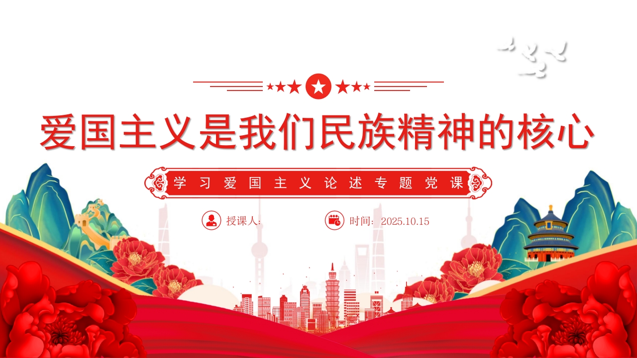 ★★★爱国主义是我们民族精神的核心学习爱国主义论述专题党课授课人:时间:2025.10.15前言习近平总书记在庆祝中华人民共和国成立76周年招待会上指出:“前不久,我们隆重纪念中国人民抗日战争暨世界反法西斯战争胜利80周年,极大振奋了民族精神、激发了爱国热情、凝聚了奋斗力量。”爱国,是人世间最深层、最持久的情感。党的十八大以来,习近平总书记多次在不同场合强调爱国的重要性、要求弘扬爱国主义精神,强调要在厚植爱国主义情怀上下功夫。今天,我们梳理了习近平总书记的部分相关重要论述,与大家一同学习领会。