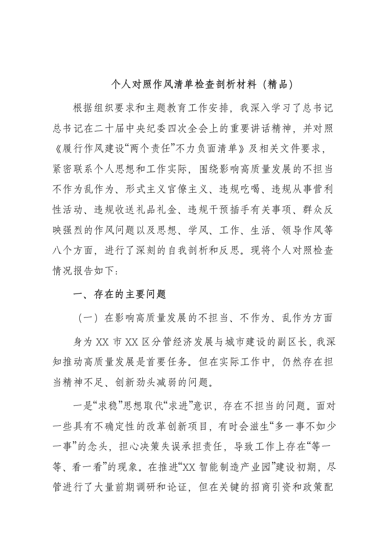 个人对照作风清单检查剖析材料(精品)根据组织要求和主题教育工作安排,我深入学习了总书记总书记在二十届中央纪委四次全会上的重要讲话精神,并对照《履行作风建设“两个责任”不力负面清单》及相关文件要求,紧密联系个人思想和工作实际,围绕影响高质量发展的不担当不作为乱作为、形式主义官僚主义、违规吃喝、违规从事营利性活动、违规收送礼品礼金、违规干预插手有关事项、群众反映强烈的作风问题以及思想、学风、工作、生活、领导作风等八个方面,进行了深刻的自我剖析和反思。现将个人对照检查情况报告如下:一、存在的主要问题(一)在影响高质量发展的不担当、不作为、乱作为方面身为XX市X区分管经济发展与城市建设的副区长,我深知推动高质量发展是首要任务。但在实际工作中,仍然存在担当精神不足、创新劲头减弱的问题。一是“求稳”思想取代“求进”意识,存在不担当的问题。面对一些具有不确定性的改革创新项目,有时会滋生“多一事不如少一事”的念头,担心决策失误承担责任,导致工作上存在“等一等、看一看”的现象。在推进“XX智能制造产业园”建设初期,尽管进行了大量前期调研和论证,但在关键的招商引资和政策配套环节,面对复杂局面和不同意见,存在决策犹豫、推进迟缓的情况,错失了一些优质企业的入驻时机。这种“为了不出事,宁可不干事”的心态,实质上是担当精神的缺失,与新时代高质量发展的要求背道而驰。二是对新发展理念的理解和执行存在偏差,存在不作为的问题。对一些长期性的、基础性的工作,投入的精力不足。习惯于抓见效快的“显绩”,而对于需要“潜绩”的工作,如优化营商环境的长效机制建设、城市精细化管理的深层改革等,虽然口头上重视,但实际推动的力度和督查的频率不够。对下属部门反映的一些制约发展的“中梗阻”问题,有时只是简单批转,缺乏一抓到底的韧劲,导致一些问题悬而不决,这本质上是一种消极的不作为。三是政绩观存在偏差,偶有乱作为的倾向。在推动项目建设时,有时过于追求速度和规模,对项目实施过程中的程序合规性、环境影响评估等方面存在把关不严的情况。前年,为了赶上全省重点项目观摩会的进度,我曾催促“XX湖生态修复工程”加快施工,简化了部分审批流程,虽然项目最终按时完成,但也留下了程序瑕疵,这反映出我内心深处仍存在急功近利的错误政绩观。(二)在形式主义、官僚主义加重基层负担方面