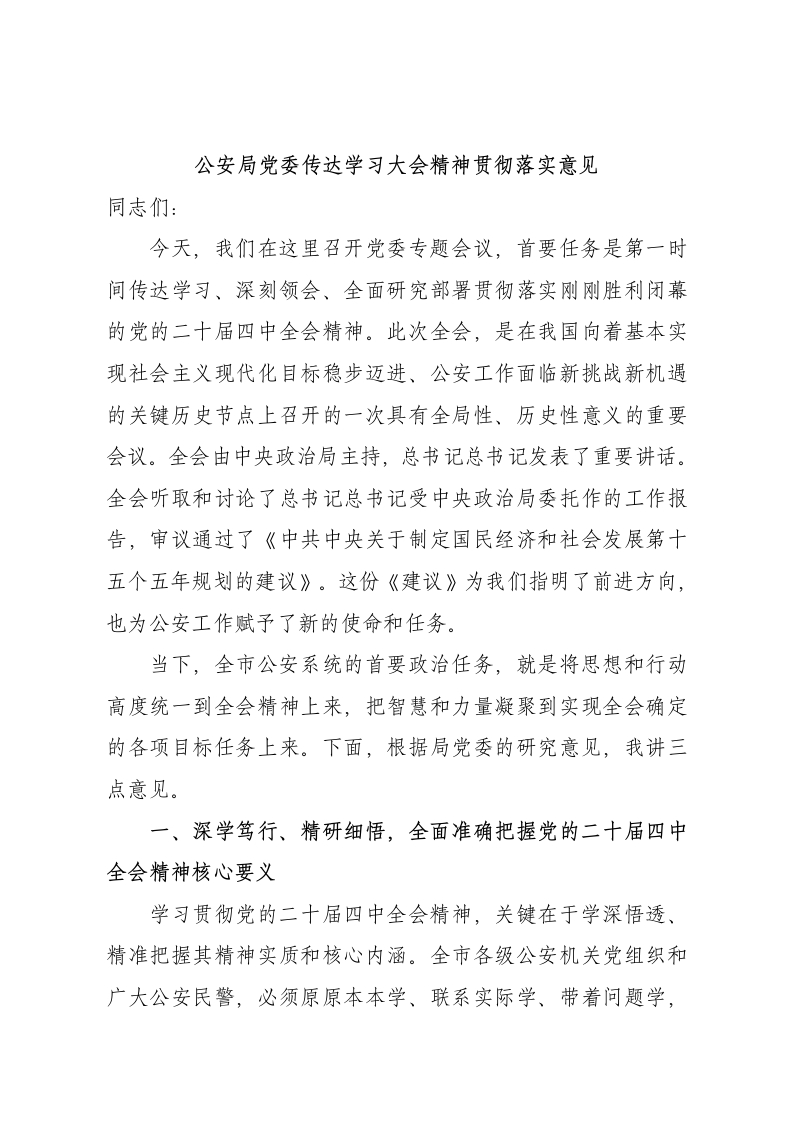 公安局党委传达学习大会精神贯彻落实意见同志们今天,我们在这里召开党委专题会议,首要任务是第一时间传达学习、深刻领会、全面研究部署贯彻落实刚刚胜利闭幕的党的二十届四中全会精神。此次全会,是在我国向着基本实现社会主义现代化目标稳步迈进、公安工作面临新挑战新机遇的关键历史节点上召开的一次具有全局性、历史性意义的重要会议。全会由中央政治局主持,总书记总书记发表了重要讲话。全会听取和讨论了总书记总书记受中央政治局委托作的工作报告,审议通过了《中共中央关于制定国民经济和社会发展第十五个五年规划的建议》。这份《建议》为我们指明了前进方向,也为公安工作赋予了新的使命和任务。当下,全市公安系统的首要政治任务,就是将思想和行动高度统一到全会精神上来,把智慧和力量凝聚到实现全会确定的各项目标任务上来。下面,根据局党委的研究意见,我讲三点意见。一、深学笃行、精研细悟,全面准确把握党的二十届四中全会精神核心要义学习贯彻党的二十届四中全会精神,关键在于学深悟透、精准把握其精神实质和核心内涵。全市各级公安机关党组织和广大公安民警,必须原原本本学、联系实际学、带着问题学,真正做到入脑入心、知行合一。(一)深刻把握全会对公安工作的战略指引全会为国家未来发展擘画了宏伟蓝图,也为公安工作指明了战略方向。在“十五五”时期,公安工作要紧紧围绕国家发展大局,为基本实现社会主义现代化创造安全稳定的政治社会环境。我们要深刻认识到公安工作在维护国家政治安全、确保社会大局稳定、促进社会公平正义、保障人民安居乐业等方面的重要作用,以高度的政治责任感和使命感履行好职责。(二)深刻领会“十四五”成就对公安工作的启示“十四五”时期,我国在经济社会发展等各方面取得了举世瞩目的成就,这离不开稳定的社会环境和有力的法治保障。公安工作在其中发挥了重要作用,同时也积累了宝贵经验。我们要深刻领会这些成就背后的根本原因,即坚持党的全面领导、坚持以人民为中心、坚持改革创新等。在今后的工作中,我们要继续发扬这些优良传统,不断提升公安工作的能力和水平。(三)深刻理解“十五五”公安工作的指导思想“十五五”时期,公安工作要高举中国特色社会主义伟大旗帜,全面贯彻总书记新时代中国特色社会主义思想,紧紧围绕全面建成社会主义现代化强国、实现第二个百年奋斗目标,以中国式现代化全面推进中华民族伟大复兴这个中心任务,统筹推进公安工作的各项任务。我们要坚持总体国家安全观,以人