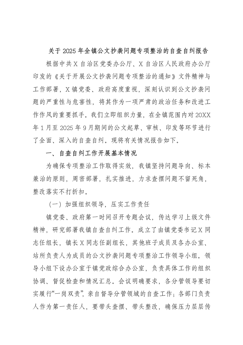 关于2025年全镇公文抄袭问题专项整治的自查自纠报告根据中共X自治区党委办公厅、X自治区人民政府办公厅印发的《关于开展公文抄袭问题专项整治的通知》文件精神与工作部署,X镇党委、政府高度重视,深刻认识到公文抄袭问题的严重性与危害性,将其作为一项严肃的政治任务和改进工作作风的重要抓手。我们立即组织力量,在全镇范围内对20XX年1月至2025年9月期间的公文起草、审核、印发等环节进行了全面、深入的自查自纠。现将有关情况报告如下。一、自查自纠工作开展基本情况为确保专项整治工作取得实效,我镇坚持问题导向、标本兼治的原则,周密部署,扎实推进,力求查摆问题不留死角,整改落实不打折扣。(一)加强组织领导,压实工作责任镇党委、政府第一时间召开专题会议,传达学习上级文件精神,研究部署我镇自查自纠工作。成立了由镇党委书记X同志任组长,镇长X同志任副组长,其他班子成员及各办公室、站所负责人为成员的公文抄袭问题专项整治工作领导小组。领导小组下设办公室于镇党政综合办公室,负责具体工作的组织协调、督促检查和情况汇总。会议明确要求,各分管领导要切实履行“一岗双责”亲自督导分管领域的自查工作;各部门负责人作为第一责任人,要带头查摆、带头整改,确保压力层层传导、责任环环相扣,在全镇范围内形成主要领导亲自抓、分管领导具体抓、各部门共同抓的良好工作格局。(二)明确排查范围,全面深入自查本次自查的时间范围为20XX年1月1日至2025年9月30日。排查对象涵盖我镇党委、政府及下属各部门制发的各类公文和文字材料,主要包括:向上级报送的请示、报告、总结;向下级印发的通知、决定、方案;在各类会议上的领导讲话稿、交流发言材料;对外发布的宣传稿件、工作信息、调研报告等。据初步统计,在本次自查期间,我镇共制发各类公文及文字材料1258件。其中,工作报告与总结类415件,占33.0%;工作方案与计划类352件,占28.0%;通知与通报类301件,占23.9%;请示与函件类110件,占8.7%;其他各类材料80件,占6.4%。我们要求各部门对所有存档文件进行逐一梳理、比对、甄别,建立自查台账,确保全覆盖、无遗漏。(三)创新检查方式,确保排查实效为避免自查工作流于形式,我们采取了“三结合”的检查方式。一是部门自查与交叉互查相结合。各部门首先对照整治要求开展自查,形成问题清单。随后,由领导小组办公室牵头,组织农业服务中心、经济发展办公室、社会事务办公室等部门进行交叉检查,相互“挑刺”相互借鉴,打破部门壁垒,有效发现“灯下黑”问题。二是不定期抽查与重点核查相结合。镇党政