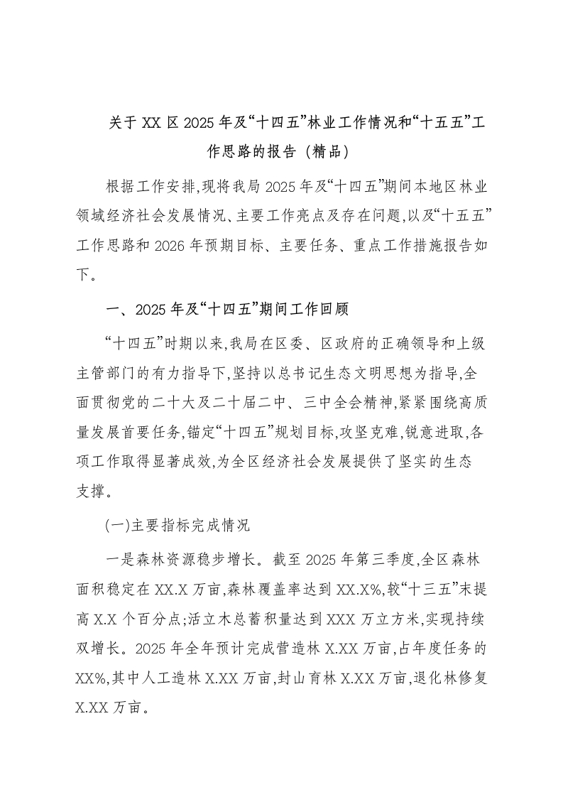 关于XX区2025年及“十四五”林业工作情况和“十五五”工作思路的报告(精品)根据工作安排,现将我局2025年及“十四五”期间本地区林业领域经济社会发展情况、主要工作亮点及存在问题,以及“十五五”工作思路和2026年预期目标、主要任务、重点工作措施报告如下。一、2025年及“十四五”期间工作回顾“十四五”时期以来,我局在区委、区政府的正确领导和上级主管部门的有力指导下,坚持以总书记生态文明思想为指导,全面贯彻党的二十大及二十届二中、三中全会精神,紧紧围绕高质量发展首要任务,锚定“十四五”规划目标,攻坚克难,锐意进取,各项工作取得显著成效,为全区经济社会发展提供了坚实的生态支撑。(一)主要指标完成情况一是森林资源稳步增长。截至2025年第三季度,全区森林面积稳定在XX.X万亩,森林覆盖率达到XX.X%,较“十三五”未提高XX个百分点;活立木总蓄积量达到XX万立方米,实现持续双增长。2025年全年预计完成营造林X.XX万亩,占年度任务的XX%,其中人工造林XXX万亩,封山育林XXX万亩,退化林修复XXX万亩。二是林业经济提质增效。全区林业产业结构持续优化,发展动能不断增强。2025年,全区林业总产值预计达到XX.X亿元,同比增长XX%。其中,林下经济发展迅猛,利用森林面积达到X万亩,林下经济产值预计实现XX亿元,同比增长X%,重点发展的林药、林菌、林花等特色基地规模不断扩大,成为农民增收的新增长点。三是资源保护底线筑牢。严格落实耕地保护和粮食安全责任制,全区耕地和永久基本农田保护面积分别稳定在X.X万亩和X.XX万亩以上,牢牢守住了耕地红线。2025年上半年,通过就地恢复和调整补划等方式恢复耕地约XXX亩,占年度任务的XX%,补充耕地指标入库约XXX亩,实现了耕地占补平衡有余。(二)主要工作亮点一是规划引领作用凸显。国土空间规划体系不断完善,规划传导与报批加速推进。完成X个单元地块详细规划编制初稿,中心城区详细规划覆盖率稳步提升。2024年度精品示范村“多规合一”实用性村庄规划报批工作全面完成,2025年度村庄规划编制计划已制定下发,为乡村振兴提供了科学的空间指引。二是生态修复工程扎实推进。山水林田湖草沙一体化保护和修复工程取得阶段性成果,省级财政补助资金使用规范高效。2025年
