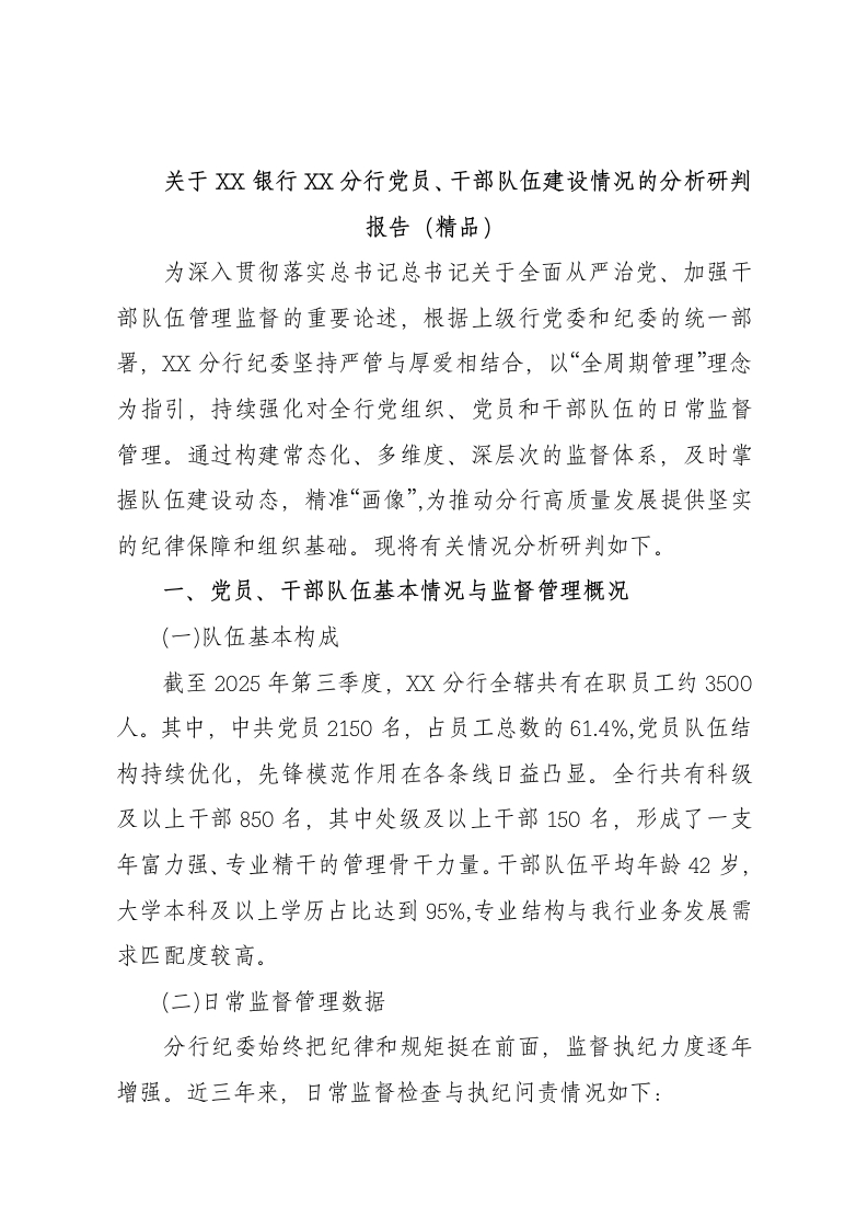 关于X银行X分行党员、干部队伍建设情况的分析研判报告(精品)为深入贯彻落实总书记总书记关于全面从严治党、加强干部队伍管理监督的重要论述,根据上级行党委和纪委的统一部署,X分行纪委坚持严管与厚爱相结合,以“全周期管理”理念为指引,持续强化对全行党组织、党员和干部队伍的日常监督管理。通过构建常态化、多维度、深层次的监督体系,及时掌握队伍建设动态,精准“画像”,为推动分行高质量发展提供坚实的纪律保障和组织基础。现将有关情况分析研判如下。一、党员、干部队伍基本情况与监督管理概况(一)队伍基本构成截至2025年第三季度,X分行全辖共有在职员工约3500人。其中,中共党员2150名,占员工总数的61.4%.党员队伍结构持续优化,先锋模范作用在各条线日益凸显。全行共有科级及以上千部850名,其中处级及以上千部150名,形成了一支年富力强、专业精干的管理骨干力量。干部队伍平均年龄42岁,大学本科及以上学历占比达到95%,专业结构与我行业务发展需求匹配度较高。(二)日常监督管理数据分行纪委始终把纪律和规矩挺在前面,监督执纪力度逐年增强。近三年来,日常监督检查与执纪问责情况如下:2022年度,开展各类监督检查1500余次,立案审查违纪案件25起,给予党纪政务处分32人次。2023年度,开展各类监督检查1850余次,立案审查违纪案件31起,给予党纪政务处分40人次。2024年度,开展各类监督检查2100余次,立案审查违纪案件35起,给予党纪政务处分45人次。数据表明,随着监督网络日益织密,发现和查处问题的能力显著提升,严的基调和氛围得到持续巩固。进入2025年以来,分行纪委已组织开展各类廉政谈话120余场次,对850余人次的干部提拔、岗位调整出具了廉洁意见,组织了3场覆盖关键岗位人员的现场警示教育活动,队伍的纪律意识和规矩意识得到进一步强化。二、强化日常监督管理的主要做法与成效分行纪委深入学习领会“严管就是厚爱”的核心要义,贯通协同党委主体责任与纪委监督责任,将“全周期管理”理念深度融入党员、干部队伍建设,通过环环相扣的监督举措,推动形成知敬畏、存戒惧、守底线的政治生态。(一)紧抓教育预防,把好思想“总开关”思想是行动的先导。分行纪委始终将思想政治建设和纪律教育摆在首位,督促各级党组织扛起主体责任,将廉洁从业教育融入业务发展和队伍建设的全过程、各方面。