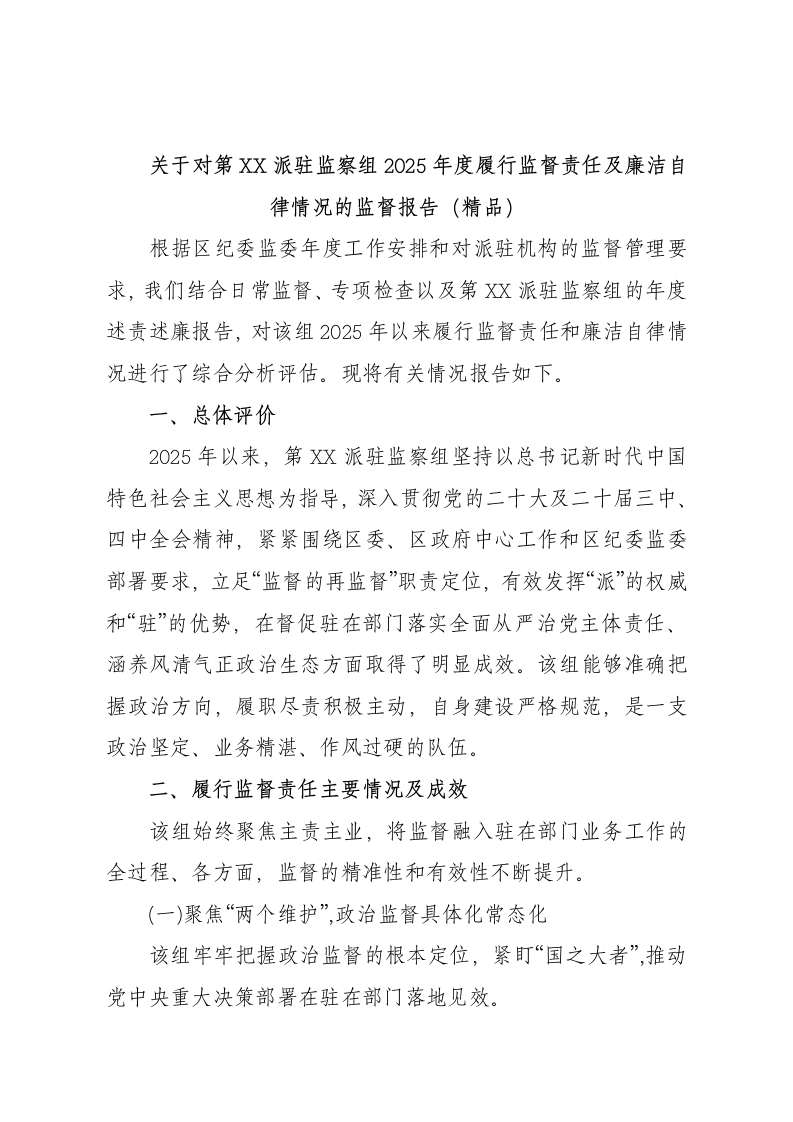 关于对第XX派驻监察组2025年度履行监督责任及廉洁自律情况的监督报告(精品)根据区纪委监委年度工作安排和对派驻机构的监督管理要求,我们结合日常监督、专项检查以及第X派驻监察组的年度述责述廉报告,对该组2025年以来履行监督责任和廉洁自律情况进行了综合分析评估。现将有关情况报告如下。一、总体评价2025年以来,第X派驻监察组坚持以总书记新时代中国特色社会主义思想为指导,深入贯彻党的二十大及二十届三中、四中全会精神,紧紧围绕区委、区政府中心工作和区纪委监委部署要求,立足“监督的再监督”职责定位,有效发挥“派”的权威和“驻”的优势,在督促驻在部门落实全面从严治党主体责任、涵养风清气正政治生态方面取得了明显成效。该组能够准确把握政治方向,履职尽责积极主动,自身建设严格规范,是一支政治坚定、业务精湛、作风过硬的队伍。二、履行监督责任主要情况及成效该组始终聚焦主责主业,将监督融入驻在部门业务工作的全过程、各方面,监督的精准性和有效性不断提升。(一)聚焦“两个维护”,政治监督具体化常态化该组牢牢把握政治监督的根本定位,紧盯“国之大者”,推动党中央重大决策部署在驻在部门落地见效。一是监督内容清晰精准。围绕总书记总书记关于推动高质量发展、保障和改善民生等系列重要讲话和指示批示精神,该组通过列席党组会、开展专项督查等方式,对X区城市更新、X产业园建设、优化营商环境等重大决策部署的落实情况进行跟进监督,确保政令畅通、执行有力。全年共开展相关政治监督检查43次,发现并推动整改问题51个。二是监督机制健全完善。严格落实与驻在部门党组的会商研判机制,坚持每季度通报监督情况、每半年专题研究一次全面从严治党工作。创新实施“嵌入式”监督,派员全程参与驻在部门巡察整改、民主生活会等重要政治活动,提出整改建议,压实政治责任。全年与驻在部门党组主要负责同志开展专题会商4次,与领导班子成员开展廉政谈话提醒95人次,批评教育18人次,有效传导了压力。三是监督成效切实显现。紧盯“关键少数”,特别是各驻在部门“一把手”和领导班子成员,协助建立健全领导干部廉政档案260余份,实现动态更新。在元旦、春节、国庆等重要节点,牵头或联合驻在部门开展作风建设专项督查12次,通过明察暗访、大数据筛查等方式,严肃查处隐形变异“四风”问题,共发出监察建议书42份,有力巩固了中央八项规定精神堤坝。(二)聚焦抓早抓小,日常监督精细化规范化该组坚持把纪律和规矩挺在前面,深化运用“四种形态”特别是第一种形态,
