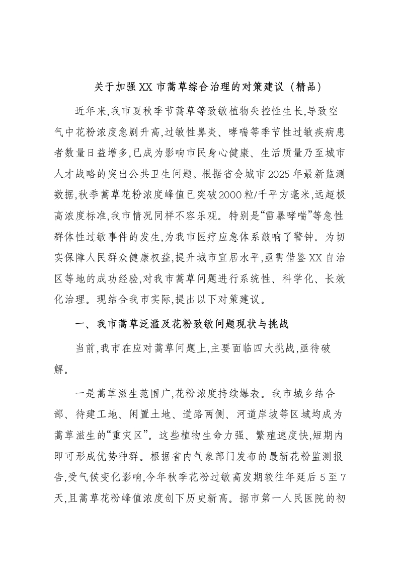 关于加强X市蒿草综合治理的对策建议(精品)近年来,我市夏秋季节蒿草等致敏植物失控性生长,导致空气中花粉浓度急剧升高,过敏性鼻炎、哮喘等季节性过敏疾病患者数量日益增多,已成为影响市民身心健康、生活质量乃至城市人才战略的突出公共卫生问题。根据省会城市2025年最新监测数据,秋季蒿草花粉浓度峰值已突破2000粒/千平方毫米,远超极高浓度标准,我市情况同样不容乐观。特别是“雷暴哮喘”等急性群体性过敏事件的发生,为我市医疗应急体系敲响了警钟。为切实保障人民群众健康权益,提升城市宜居水平,亟需借鉴X自治区等地的成功经验,对我市蒿草问题进行系统性、科学化、长效化治理。现结合我市实际,提出以下对策建议。一、我市蒿草泛滥及花粉致敏问题现状与挑战当前,我市在应对蒿草问题上,主要面临四大挑战,亟待破解。一是蒿草滋生范围广,花粉浓度持续爆表。我市城乡结合部、待建工地、闲置土地、道路两侧、河道岸坡等区域均成为蒿草滋生的“重灾区”。这些植物生命力强、繁殖速度快,短期内即可形成优势种群。根据省内气象部门发布的最新花粉监测报告,受气候变化影响,今年秋季花粉过敏高发期较往年延后5至7天,且蒿草花粉峰值浓度创下历史新高。据市第一人民医院的初步监测,我市花粉浓度在8至10月期间长期处于高位运行状态,对市民健康构成直接威胁。二是过敏患者基数大,公共卫生压力剧增。据国家流行病学调查数据显示,我国北方地区成人过敏性鼻炎发病率高达10%至30%,儿童更是达到40%。以此估算,我市过敏性疾病患者群体规模庞大,或已达数十万之众。每年夏秋季节,各级医院门诊量激增,大量患者饱受鼻塞、流涕、眼痒、咳嗽、憋气之苦,严重者生活、工作和学习受到严重影响,部分有条件的市民甚至选择“候鸟式”迁徙以躲避花粉季,这不仅影响了家庭的稳定,也对本市“留住人才、引进人才”战略的实施构成潜在障碍。去年9月因雷暴天气诱发的“雷暴哮喘”事件中,市第三人民医院当晚就诊相关患者达200余人次,充分暴露了极端条件下我市医疗系统面临的巨大冲击压力。三是治理模式粗放,缺乏系统性长效机制。目前,我市对蒿草的治理多停留在群众自发清理、单位被动响应的层面,如近期发布的《关于清除蒿草、共建宜居环境的倡议书》虽能调动部分积极性,但总体呈现出“头痛医头、脚痛医脚”的碎片化特征。治理手段以简单的人工拔除或割草机修剪为主,缺乏全市统一的科学规划和专业指导。尤其是在蒿草开花期进行修剪,反而可能加速花粉的扩散,治标不治本。现有治理模式未能形成覆盖全