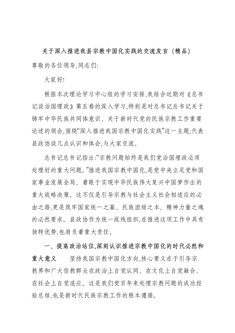 关于深入推进我县宗教中国化实践的交流发言(精品)尊敬的各位领导,同志们:大家好!根据本次理论学习中心组的学习安排,我结合近期对《总书记谈治国理政》第五卷的深入学习,特别是对总书记总书记关于铸牢中华民族共同体意识、关于新时代党的民族宗教工作重要论述的领会,围绕“深入推进我国宗教中国化实践”这一主题,代表县政协谈几点认识和体会,与大家交流。总书记总书记指出:“宗教问题始终是我们党治国理政必须处理好的重大问题。”推进我国宗教中国化,是党中央立足党和国家事业发展全局、着眼于实现中华民族伟大复兴中国梦作出的重大战略决策。这不仅是引导宗教与社会主义社会相适应的必由之路,更是筑牢国家统一之基、民族团结之本、精神力量之魂的必然要求。县政协作为统一战线组织,在推进这项工作中具有独特优势,也肩负着重大责任。一、提高政治站位,深刻认识推进宗教中国化的时代必然和重大意义坚持我国宗教中国化方向,核心要义在于引导宗教界和广大信教群众在政治上自觉认同、在文化上自觉融合、在社会上自觉适应。这是我们党百年来处理宗教问题的成功经验总结,也是新时代民族宗教工作的根本遵循。一是推进宗教中国化是铸牢中华民族共同体意识的内在要求。《总书记谈治国理政》第五卷虽然未直接设“铸牢中华民族共同体意识”的专题,但全书贯穿着强化国家认同、夯实中华民族共同体意识根基的重要思想。总书记总书记强调,中华民族共同体意识是民族团结之本。这一重要论述深刻揭示了国家统一、民族团结与精神归属的内在逻辑。宗教作为一种社会意识形态,其信众遍布不同民族。只有坚持中国化方向,引导宗教植根于中华文化沃土,用社会主义核心价值观引领、用中华优秀传统文化浸润,才能使广大信教群众不断增进对伟大祖国、中华民族、中华文化、中国共产党、中国特色社会主义的认同,将个人信仰与国家前途、民族命运紧密相连,从而为铸牢中华民族共同体意识奠定坚实的群众基础和思想根基。二是推进宗教中国化是弘扬民族团结优良传统的现实需要。不久前,我们再次学习了总书记总书记给X地区民族团结誓词碑盟誓代表后代的重要回信精神。总书记在回信中勉励大家“更好续写誓词碑故事,让民族团结的佳话代代相传”。这座民族团结的丰碑,正是爱国主义精神与民族大义的生动体现。回信精神深刻启示我们,维护民族团结,必须有共同的价值追求和精神纽带。宗教中国化的过程,就是引导各族信教群众发扬爱国爱教的优良传统,正确处理国法与教规的关系,自觉维护国家最高