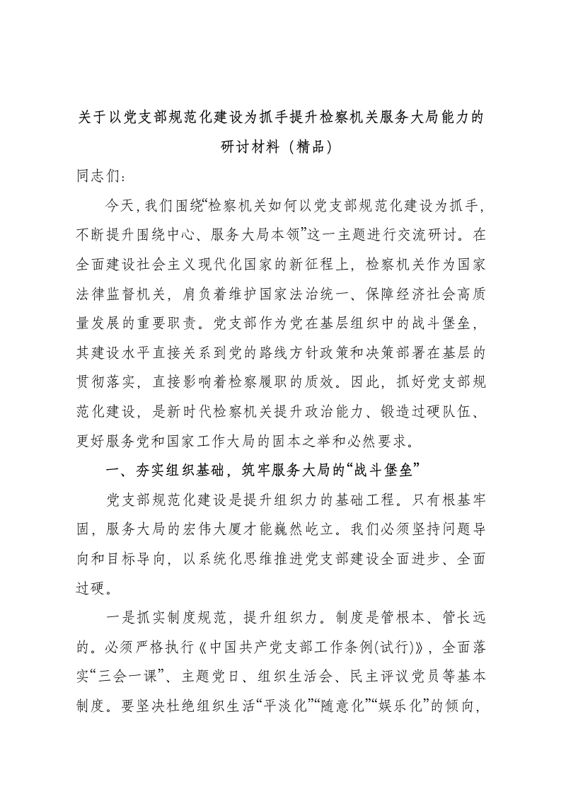 关于以党支部规范化建设为抓手提升检察机关服务大局能力的研讨材料(精品)同志们:今天,我们围绕“检察机关如何以党支部规范化建设为抓手,不断提升围绕中心、服务大局本领”这一主题进行交流研讨。在全面建设社会主义现代化国家的新征程上,检察机关作为国家法律监督机关,肩负着维护国家法治统一、保障经济社会高质量发展的重要职责。党支部作为党在基层组织中的战斗堡垒,其建设水平直接关系到党的路线方针政策和决策部署在基层的贯彻落实,直接影响着检察履职的质效。因此,抓好党支部规范化建设,是新时代检察机关提升政治能力、锻造过硬队伍、更好服务党和国家工作大局的固本之举和必然要求。一、夯实组织基础,筑牢服务大局的“战斗堡垒”党支部规范化建设是提升组织力的基础工程。只有根基牢固,服务大局的宏伟大厦才能巍然屹立。我们必须坚持问题导向和目标导向,以系统化思维推进党支部建设全面进步、全面过硬。一是抓实制度规范,提升组织力。制度是管根本、管长远的。必须严格执行《中国共产党支部工作条例(试行)》,全面落实“三会一课”、主题党日、组织生活会、民主评议党员等基本制度。要坚决杜绝组织生活“平淡化”“随意化“娱乐化”的倾向,结合检察工作实际,创新活动方式和载体让每一次组织生活都成为淬炼党性、凝聚共识、解决问题的“加油站”。正如一位同志在参加党务培训后所说,通过对党务知识的系统学习,对“三会一课”等基本要求有了更深刻的认识,为谋划好、组织好、落实好党的组织生活提供了清晰指引。二是建强骨干队伍,激活“头雁效应”。党支部书记是党支部建设的“领头雁”。要坚持把政治标准放在首位,选优配强党支部书记,并注重把业务精、作风正的年轻骨干充实到党务干部队伍中来。要建立常态化培训机制,定期组织党支部书记和委员参加党务培训,提升他们的履职能力。近期我院组织的多名党务干部赴X红色教育基地参加培训,大家普遍反映这是一次深刻的思想洗礼和能力提升,不仅深化了对党的创新理论的理解,更激发了立足本职、担当作为的干事热情。三是完善考评体系,树立鲜明导向。科学的考核评价是推动工作的“指挥棒”。要建立健全一套科学、具体、可操作的党支部规范化建设评价指标体系。该体系应涵盖政治建设、思想建设、组织建设、作风纪律建设和作用发挥等多个维度,细化量化考核标准,并将考核结果与评先评优、干部选拔任用、绩效奖励等直接挂钩形成“干与不干不一样、干好干坏大不一样”的鲜明导向。据统计,截至2025年第三季度,我市检察机关党支部规范化达标率已达到95%,创建“四强党支部XX个,有力推