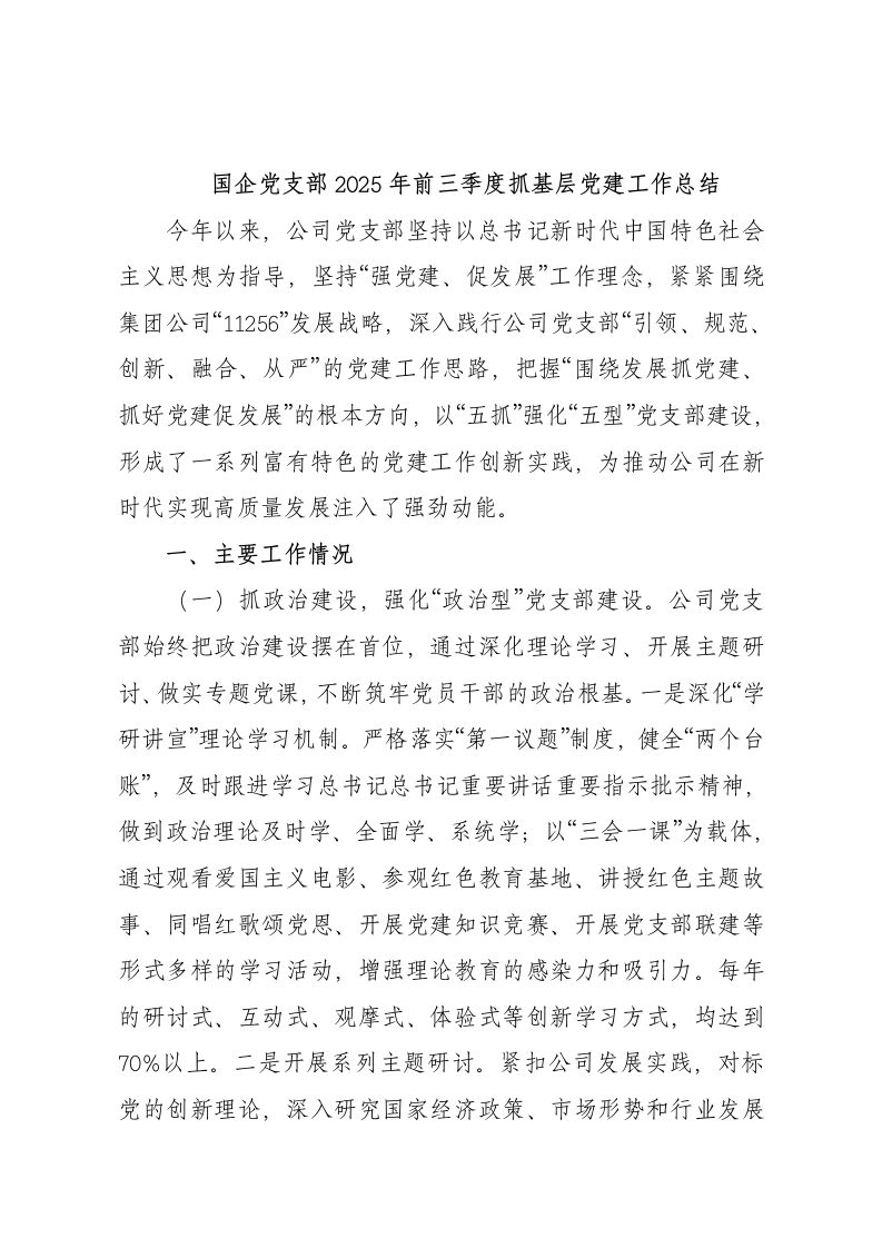 国企党支部2025年前三季度抓基层党建工作总结今年以来,公司党支部坚持以总书记新时代中国特色社会主义思想为指导,坚持“强党建、促发展”工作理念,紧紧围绕集团公司“11256”发展战略,深入践行公司党支部“引领、规范、创新、融合、从严”的党建工作思路,把握“围绕发展抓党建、抓好党建促发展”的根本方向,以“五抓”强化“五型”党支部建设,形成了一系列富有特色的党建工作创新实践,为推动公司在新时代实现高质量发展注入了强劲动能。一、主要工作情况(一)抓政治建设,强化“政治型”党支部建设。公司党支部始终把政治建设摆在首位,通过深化理论学习、开展主题研讨、做实专题党课,不断筑牢党员干部的政治根基。一是深化“学研讲宣”理论学习机制。严格落实“第一议题”制度,健全“两个台账”,及时跟进学习总书记总书记重要讲话重要指示批示精神,做到政治理论及时学、全面学、系统学;以“三会一课”为载体,通过观看爱国主义电影、参观红色教育基地、讲授红色主题故事、同唱红歌颂党恩、开展党建知识竞赛、开展党支部联建等形式多样的学习活动,增强理论教育的感染力和吸引力。每年的研讨式、互动式、观摩式、体验式等创新学习方式,均达到70%以上。二是开展系列主题研讨。紧扣公司发展实践,对标党的创新理论,深入研究国家经济政策、市场形势和行业发展趋势,多次就“如何促进集团公司产业发展”、“十四五”规划编制”“如何推动公司创新发展“如何推动绿色低碳和数字化转型”等开展党建结构化研讨,形成了党建与业务工作同心划船、同向发力的新局面。三是开展专题党课宣讲。坚持把开展专题党课作为深化理论武装、强化党员教育的重要抓手。一方面,精心策划专题党课内容,确保紧贴当前党中央重大决策部署和企业改革发展实际。另一方面,注重方式创新与参与广度,推动党课宣讲制度化、规范化、多样化。党支部书记和党员领导干部主动带头讲党课,深入进行政策宣讲与理论阐释。同时,组织普通党员开展“人人讲微党课”活动,以岗位建功、廉洁自律等为切入点,用“小切口”讲“大主题”、用“小故事”讲“大道理”,增强教育的亲和力、感染力和实效性。通过专题党课的持续开展,党员的政治理论素养和党性意识明显增强,形成了“领导带头讲、党员主动学、集体深入悟”的浓厚学习氛围。(二)抓标准化建设,强化“规范型”党支部建设。一是实施“3+1”闭环管理机制。党支部立足国有企业党建工作实际,系统实施“3+1”闭环管理机制。梳理制定“三项清单”作为抓实抓细党建的基础性工具。制定“第一议题”制度学习贯彻落实事项清单。明确学习重点,确保第一时间学、第一时间传达、第一时间贯彻。细化前置研究讨论事项清单。聚焦公司“三重一大”事项,确保党组织发挥政治把关作用不虚化、不弱化、不缺位。