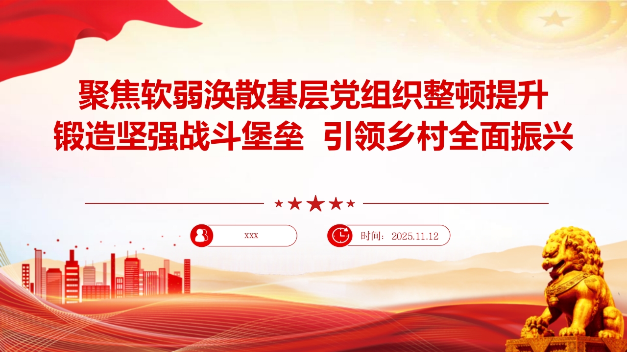 聚焦软弱涣散基层党组织整顿提升锻造坚强战斗堡垒引领乡村全面振兴★★★★★时间:2025.11.12前言导读今天,我们齐聚在*村,召开这次专题党课,主要目的就是围绕软弱涣散基层党组织整顿提升这一重要课题,与大家进行一次深入的交流和探讨。这项工作,是党中央着眼于夯实党的执政根基、推进国家治理体系和治理能力现代化作出的重大部署,也是我们推动乡村全面振兴、实现高质量发展的必然要求。刚才,我看到了村容村貌的新变化,也感受到了大家干事创业的热情,这很好。但我们更要清醒地认识到,基础不牢,地动山摇。*村党组织被列为整顿对象,这既是压力,更是动力。希望通过今天的党课,我们能够统一思想、深化认识、明确方向、凝聚力量,共同打赢这场整顿提升的攻坚战,把我们*村的党组织建设成为名副其实的坚强战斗堡垒。下面,我将围绕“为什么整顿、整顿什么、怎么整顿、如何巩固”四个方面,与同志们作深入交流。