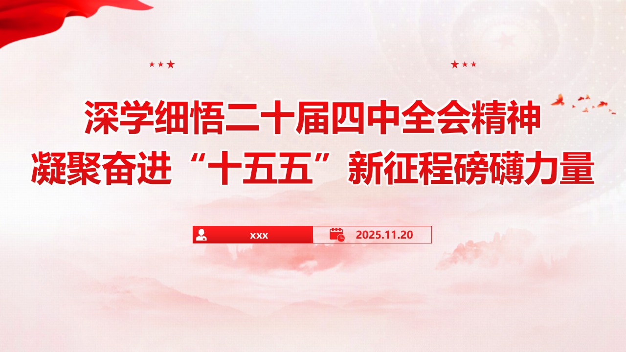 ★★★★★★深学细悟二十届四中全会精神新征程磅礴力量XXX2025.11.20中国第二十届中央委员会第四次全体会议前言PREFACE2025年10月20日至23日,党的二十届四中全会在北京胜利召开。这是在“十四五”规划即将收官、“十五五”规划谋篇布局的关键节点,在世界百年变局加速演进、我国发展面临战略机遇与风险挑战并存的特殊背景下,召开的一次具有里程碑意义的重要会议。