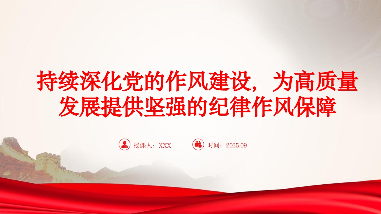 持续深化党的作风建设,为高质量发展提供坚强的纪律作风保障授课人:XXX时间:2025.09前言PREFACE作风建设关乎党的形象,关乎人心向背,关乎事业兴衰。党的十八大以来,以习近平同志为核心的党中央从制定和落实中央八项规定开局破题,严字当头、刀刃向内,以钉钉子精神纠“四风”、树新风,作风建设取得显著成效,党风政风社风焕然一新。作风建设永远在路上,全面从严治党永远在路上,党的自我革命永远在路上。我们要一以贯之认真学习习近平总书记关于加强党的作风建设的重要论述和中央八项规定及其实施细则精神,学习好运用好深入贯彻中央八项规定精神的成效和经验,一体推进学查改,推动全面从严治党向纵深发展,为推动高质量发展提供坚强的纪律作风保障。