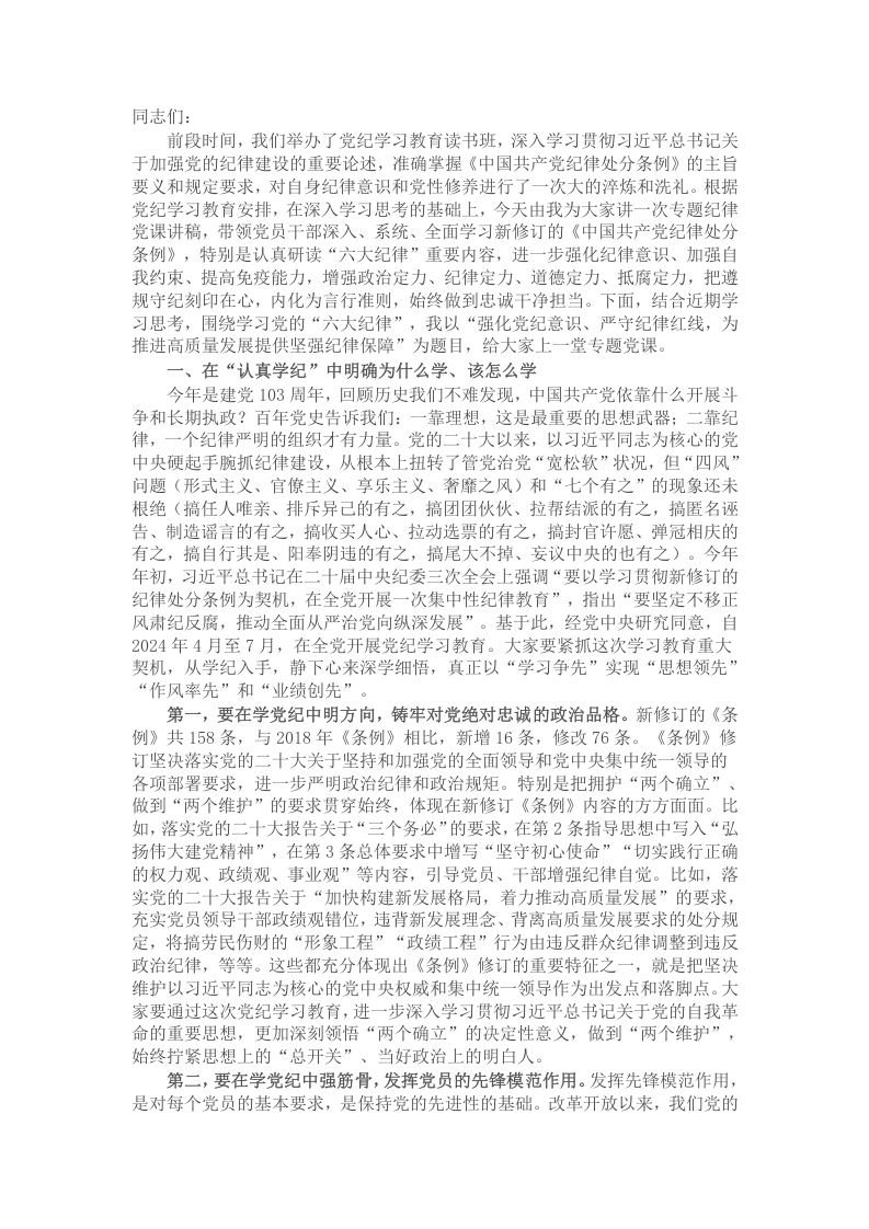 党课讲稿:强化党纪意识 严守纪律红线 为推进高质量发展提供坚强纪律保障