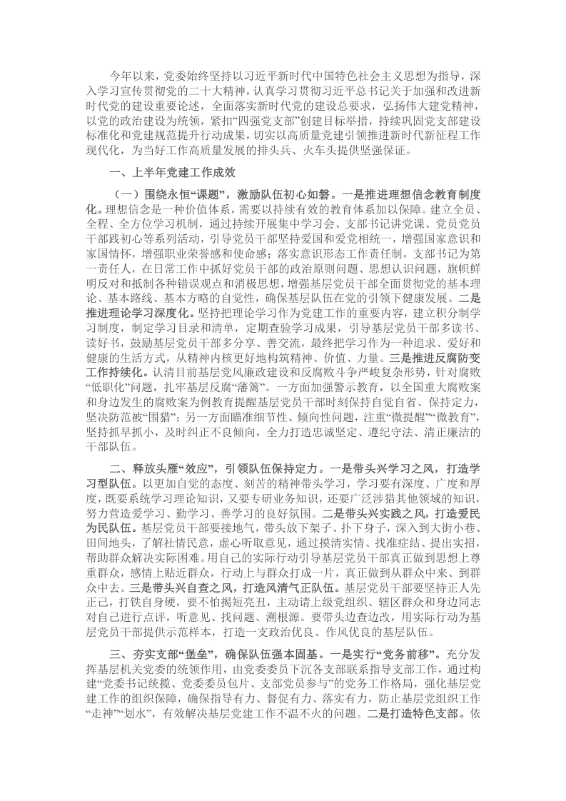 托“最强支部工作理念,在开展支部建设日常工作的基础上,根据基层一线部门特点,谋思路、想举措,结合业务工作找准党建工作的支撑点和发力点,提炼属于自身的特色亮点并上升为支部品牌,打造具有鲜明特征的基层党支部,让每个基层党组织都展现出独特魅力,形成党支部百花齐放竞芬芳的良好氛围,进一步激发基层党员干部的参与热情,增强归属感、荣誉感。三是增强交流互动。在上级党组织的统一领导下,各基层党支部应加强联系和交流,采取走出去、请进来、结对子等方式,开展主题鲜明、内容丰富、形式多样的党建工作交流活动,既做好支部文化的推介,又广泛学习借鉴其他支部好的经验,在互动中增进感情,在交流中共同提升,让党建工作在基层焕发新活力。二、基层党建工作存在的问题(一)基层党支部存在感较弱。基层实行业务、党务双重工作模式,但由于日常工作繁重,从领导到党员干部都倾向于业务工作,致使在一定程度上党建工作已经变成业务工作的附加,业务、党建工作“两张皮”的现象还不同程度存在。部分基层党支部负责人,思想深处总认为业务是硬任务,党建是软任务,在实际工作中把党组织工作放在从属地位,对党员的要求往往局限在做好本职工作上。对于党建工作只是停留在口头、纸面,没有很好的落实一岗双责”,对党建工作组织不力,抓得不紧,导致一些必要的党建活动和形式要么打折扣、要么走过场,收效甚微。(二)党建活动内容不丰富、不新颗。基层党支部活动习惯于按部就班,上级怎么要求就怎么做,没有因地制宜做足“结合和“创新”两篇文章,通常是读读报纸、念念文件、学学讲话,会让党员党员干部尤其是青年党员干部感到枯燥,失去参与组织生活的政治热情。长期一成不变的活动方式让党员党员干部感到枯燥,觉得参加组织生活是一种形式主义、一种负担,认为党建活动意义不大,浪费时间,造成党内组织生活失去吸引力,影响到基层党员尤其青年党员党员干部参与组织生活的政治热情,也影响到基层党支部的组织建设水平。(三)党建与业务工作结合不够紧密。党建工作应围绕中心、服务大局,与业务工作相辅相成,这是做好党建工作的重要遵循。然而,在相识中我们常常看到,部分基层的党建工作还是难以真正与业务相结合,二者存在相脱离的“两张皮”的现象。更有甚者,有些在面临党建工作检查时,疲于应付,造假台账、假的会议记录等,俨然失去了党建工作的意义。党建工作跟不上,久而久之就会使些党员党员干部忘记了共产党员应有的理想信念。三、下步党建工作具体举措(一)建强堡垒,提升党务工作新水平。“火车跑的快,全靠车头带”。要充分发挥支部班子成员“火车头”作用,既要当好组织领导者,又要做好实践先行者,全面发挥基层党支部的战斗堡垒作用。一要养成开拓创新的思维方式。思路决定出路,基层党建工作要有新的起色,实现新的突破,必须在工作思路上有所创新。要主动破除固化思维,以创新思维推动党建,始终保持在学习状态下研究工作,做到在学习中思考,在思考中实践,在实践中探索,在探索中提高,使系统党建工作的整体思路更加适应新时期党建工作的新要求:二要增强统揽驾驭全局的能力。要当好主心骨、掌舵人,吃透上情、掌握实情,全面系统辩证看待党建工作的优势和劣势,抓住主要矛盾,有的放矢地开展好工作。尤其在新形势下要找准