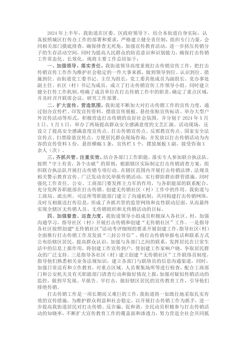 2024年上半年,我街道在区委、区政府领导下,结合本街道自身实际,认真按照城区打传办工作的部署和要求,严格建立健全责任制,组织专门力量,会同相关部门摸底排查,确保排查无死角,加强宣传教育活动,进一步挤压传销分子的生存活动空间,同时为提高人民群众的防范意识和识别能力,确保打击传销工作常态化、长效化。现将主要工作总结如下:一、加强领导,落实责任。我街道领导高度重视打击传销宣传工作,把打击传销宣传工作作为维护社会稳定的一件大事来抓,做到领导到位、认识到位、措施到位。由街道党工委书记、主任为组长,党工委其他成员为副组长、党办事处副主任、社区(村)书记为成员,成立了打击传销宣传工作领导小组。同时建立健全打传工作机制,明确了成员单位在打击传销工作中的职责,确定了重点区域,并及时召开联席会议,研究工作部署。二、扩大宣传,营造氛围。我街道不断加大对打击传销工作的宣传力度,通过创办宣传栏、印发宣传资料、摆放宣传展板、悬挂张贴宣传标语、举办大型户外宣传活动等形式,积极营造打击传销的良好社会氛围。并分别于2024年X月X日、X月X日,举办了两场提高群众安全感满意度的文艺汇演。活动现场,还设立了提高安全感满意度宣传点、打击传销宣传点、反邪教宣传点、国家安全法宣传点、扫黑除恶宣传点,方便居民群众现场咨询:并发放以打击传销活动为内容的宣传资料X份,悬挂横幅X条,宣传栏X个,摆放展板X副,接受咨询X余人(次)。三、齐抓共管,注重实效。结合各部门工作职能,落实专人参加联合执法队。按照“守土有责,各个击破”的原则,根据辖区实际制定打击传销清查方案,组织联合执法队开展打击传销专项行动。在辖区范围内开展打击传销法律、法规及相关警示教育宣传。广泛发动市民举报传销活动,实行群防群治群管措施。同时强化工作责任,公安、工商部门要发挥主力军的作用,与各职能部的联系配合,允分发挥各职能部在打击传销、创建无传销社区(村)工作中的作用。我街道与工商局、派出所、司法所等职能部门建立了沟通机制,共同构建打击传销网络,及时互相报送打传信息,形成了齐抓共管的监管网络和良性联动层面,从而最终实现全辖区无传销人员、无传销组织和无传销活动的目标。四、加强督查、巡查力度。我街道领导小组成员积极深入各社区、村,加强沟通学习,指导社区(村)开展打击传销和创建“无传销社区”工作。一是指导各社区按照创建“无传销社区”活动考评细则的要求开展创建工作,指导社区(村)全面推行打击传销工作及发放“三封公开信”。将打击传销举报电话和联系方式公布给辖区居民,提高群众认识,加强与各部门之间的联系,发挥居民在日常生活中的信息上报作用,将创建工作宣传到户,使创建工作家响户晓,争取居民群众的广泛支持。三是指导各社区(村)建立创建“无传销社区”工作联络员制度,指导他们熟悉相关业务法规知识,建立各部门与联络员的信息沟通渠道,同时,加强日常巡有和立作教育,对重点区域、人员聚集场所等进行检查,配合工商部门和公安机关及有关职能部门清查行动和做好情况上报,加强对疑似传销活动的监控,做到早发现、早报告、早打击,做好辖区居民的宣传教育工作,引导他们排绝传销。打击传销工作是一项长期而又难巨的工作,我街道将一如既往地采取扎实有效的宣传措施,为维护群众利益和社会稳定,以开展打击传销工作为抓手,进一步提高我街道居民对打击传销、反诈骗、促和谐,全民动员积极参与打击传销活动的知晓率,不断扩大宣传教育工作的覆盖面和渗透力,努力营造全社会共同抵制传销、打击传销的良好氛围:激发社区(村)、物业管理等机构的责任意识,加强对重点区域的巡查与监控,健全“打、防、控、管”打击传销长效监管机制,努力维持全街道无传销人员、无传销组织的工作格局。