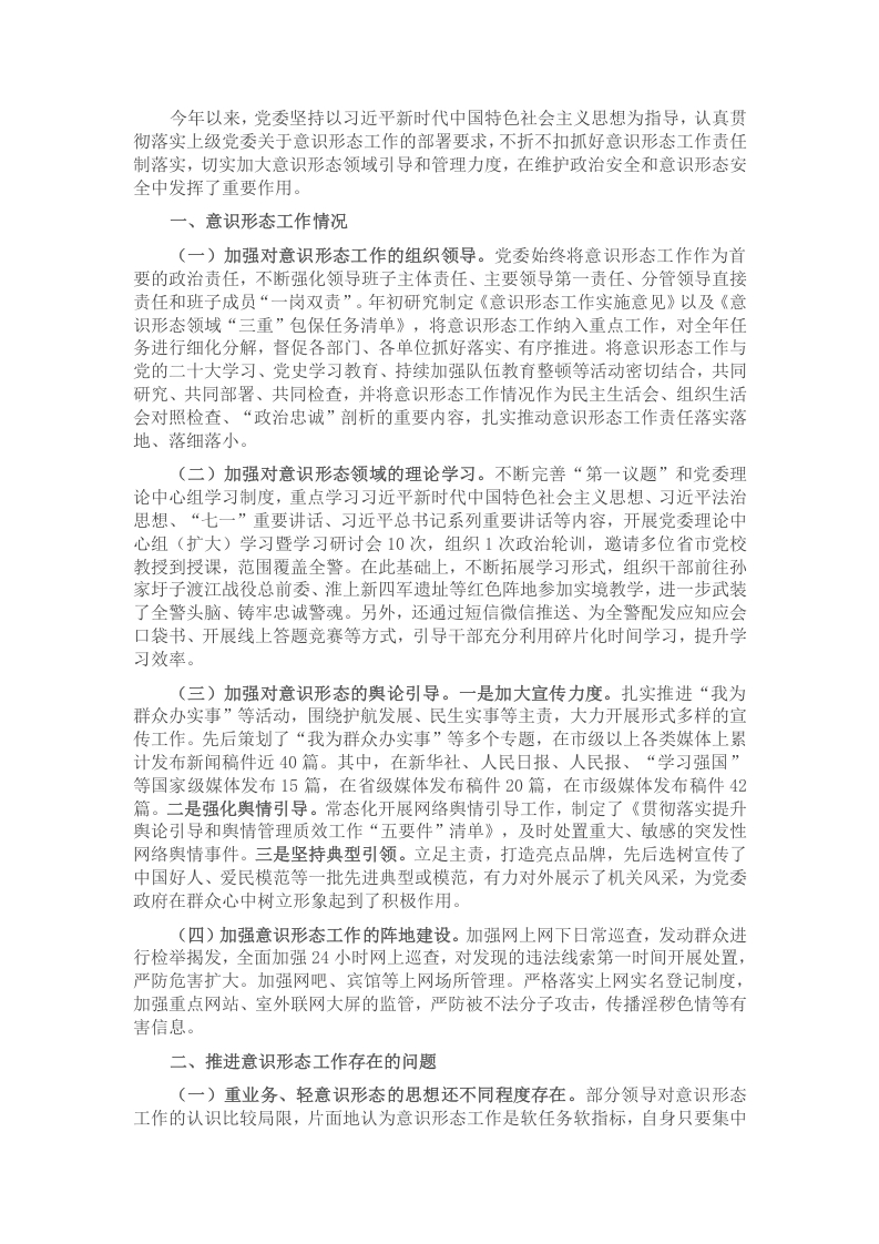 今年以来,党委坚持以习近平新时代中国特色社会主义思想为指导,认真贯彻落实上级党委关于意识形态工作的部署要求,不折不扣抓好意识形态工作责任制落实,切实加大意识形态领域引导和管理力度,在维护政治安全和意识形态安全中发挥了重要作用。一、意识形态工作情况(一)加强对意识形态工作的组织领导。党委始终将意识形态工作作为首要的政治责任,不断强化领导班子主体责任、主要领导第一责任、分管领导直接责任和班子成员“一岗双责”。年初研究制定《意识形态工作实施意见》以及《意识形态领域“三重”包保任务清单》,将意识形态工作纳入重点工作,对全年任务进行细化分解,督促各部门、各单位抓好落实、有序推进。将意识形态工作与党的二十大学习、党史学习教育、持续加强队伍教育整顿等活动密切结合,共同研究、共同部署、共同检查,并将意识形态工作情况作为民主生活会、组织生活会对照检查、“政治忠诚”剖析的重要内容,扎实推动意识形态工作责任落实落地、落细落小。(二)加强对意识形态领域的理论学习。不断完善“第一议题”和党委理论中心组学习制度,重点学习习近平新时代中国特色社会主义思想、习近平法治思想、“七一”重要讲话、习近平总书记系列重要讲话等内容,开展党委理论中心组(扩大)学习暨学习研讨会10次,组织1次政治轮训,邀请多位省市党校教授到授课,范围覆盖全警。在此基础上,不断拓展学习形式,组织干部前往孙家圩子渡江战役总前委、淮上新四军遗址等红色阵地参加实境教学,进一步武装了全警头脑、铸牢忠诚警魂。另外,还通过短信微信推送、为全警配发应知应会口袋书、开展线上答题竞赛等方式,引导干部充分利用碎片化时间学习,提升学习效率。(三)加强对意识形态的舆论引导。一是加大宣传力度。扎实推进“我为群众办实事”等活动,围绕护航发展、民生实事等主责,大力开展形式多样的宣传工作。先后策划了“我为群众办实事”等多个专题,在市级以上各类媒体上累计发布新闻稿件近40篇。其中,在新华社、人民日报、人民报、“学习强国”等国家级媒体发布15篇,在省级媒体发布稿件20篇,在市级媒体发布稿件42篇。二是强化奥情引导。常态化开展网络舆情引导工作,制定了《贯彻落实提升舆论引导和舆情管理质效工作“五要件”清单》,及时处置重大、敏感的突发性网络舆情事件。三是坚持典型引领。立足主责,打造亮点品牌,先后选树宣传了中国好人、爱民模范等一批先进典型或模范,有力对外展示了机关风采,为党委政府在群众心中树立形象起到了积极作用。(四)加强意识形态工作的阵地建设。加强网上网下日常巡查,发动群众进行检举揭发,全面加强24小时网上巡查,对发现的违法线索第一时间开展处置,严防危害扩大。加强网吧、宾馆等上网场所管理。严格落实上网实名登记制度,加强重点网站、室外联网大屏的监管,严防被不法分子攻击,传播淫秽色情等有害信息。二、推进意识形态工作存在的问题(一)重业务、轻意识形态的思想还不同程度存在。部分领导对意识形态工作的认识比较局限,片面地认为意识形态工作是软任务软指标,自身只要集中精力投入到绩效等立竿见影的工作上就行,在处理业务工作和意识形态工作方面出现“一手软、一手硬”的现象。(二)宣传手段方式还不丰富。当前意识形态宣传工作有时还沿用老经验、老方法,主动融入数据时代、运用新媒体开展宣传工作的思路和形式还有待进一步丰富。(三)坚决斗争的态度不够鲜明。部分干部在面对身边人或者网络上出现的错误思潮、错误言论,有时缺乏顶真碰硬的决心,及时站出来坚决反对的鲜明态度还有待加强。(四)网络舆情处置水平有待提升。在舆情处置方面更多的是事后处置,事前预防的前瞻性做得还不够。此外,领域网络大V的培养力度还不够,在网络上的号召力有待进一步提升。三、下一步工作措施(一)强化理论知识武装。始终把学习宣传贯彻习近平新时代中国特色社会主义思想作为首要任务,以持续深化主题教育为抓手,通过上党课、中心组学习等方式,不断加强党员思想建设工作力度,推动打造学习型党组织,进一步树牢正确的人生观、价值观和全心全意为人民服务的宗旨意识。(二)强化舆论宣传引导。融合传统媒体和新媒体,围绕诈骗防范、政策宣传等重点工作,开展立体式、全景式的宣传报道,提高舆论引导水平。对重大事件、突发性问题和一些苗头性现象,努力做到早预见、早发现、早介入,制定应急预案,防患于未然,特别注意掌握网络舆情,牢牢掌握舆情处置的主动权。(三)突出阵地建设管理。深入推进专项行动,坚决查处有害政治性出版物,不断净化社会环境。深入排查影响社会政治稳定的隐患苗头,推动宣传工作走进广场、走入社区、走进校园、走入网络,坚决遏制各类非法活动。(四)深入推进队伍建设。加强党员理想信念教育,提高党性觉悟,涵养廉洁文化。常态化开展文艺宣传策划,持续展现服务保障社会稳定发展的良好形象。(五)健全完普工作机制。定期召开意识形态工作联席会议,分析研判意识形态领域存在的问题和风险点,研究提出对策建议。加强意识形态队伍建设,分层分级开展意识形态专题培训,培育安全员、督导员、宣讲员、网评员“四支队伍”。强化预警监测、