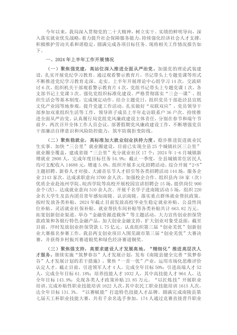 县人社局2024年上半年工作总结和下半年工作安排