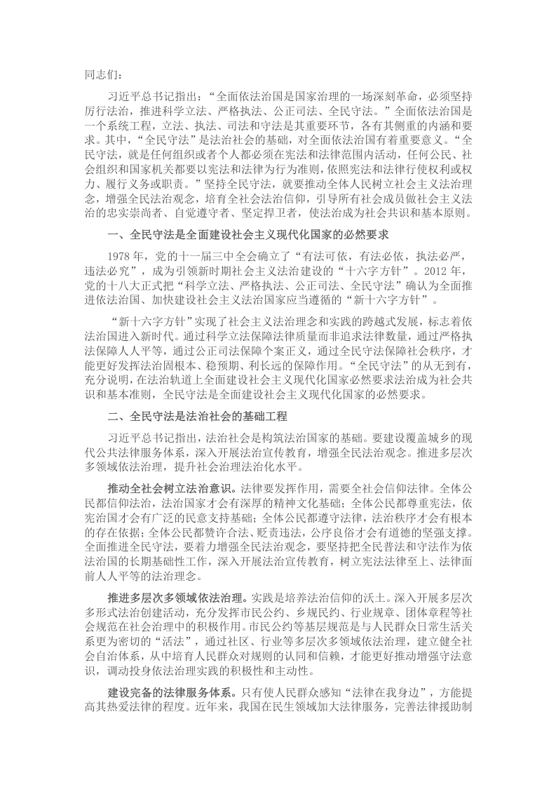 同志们:习近平总书记指出:“全面依法治国是国家治理的一场深刻革命,必须坚持厉行法治,推进科学立法、严格执法、公正司法、全民守法。”全面依法治国是一个系统工程,立法、执法、司法和守法是其重要环节,各有其侧重的内涵和要求。其中,“全民守法”是法治社会的基础,对全面依法治国有着重要意义。“全民守法,就是任何组织或者个人都必须在宪法和法律范围内活动,任何公民、社会组织和国家机关都要以宪法和法律为行为准则,依照宪法和法律行使权利或权力、履行义务或职责。”坚持全民守法,就要推动全体人民树立社会主义法治理念,增强全民法治观念,培育全社会法治信仰,引导所有社会成员做社会主义法治的忠实崇尚者、自觉遵守者、坚定捍卫者,使法治成为社会共识和基本原则。一、全民守法是全面建设社会主义现代化国家的必然要求1978年,党的十一届三中全会确立了“有法可依,有法必依,执法必严,违法必究”,成为引领新时期社会主义法治建设的“十六字方针”。2012年,党的十八大正式把“科学立法、严格执法、公正司法、全民守法”确认为全面推进依法治国、加快建设社会主义法治国家应当遵循的“新十六字方针”“新十六字方针”实现了社会主义法治理念和实践的跨越式发展,标志着依法治国进入新时代。通过科学立法保障法律质量而非追求法律数量,通过严格执法保障人人平等,通过公正司法保障个案正义,通过全民守法保障社会秩序,才能更好发挥法治固根本、稳预期、利长远的保障作用。“全民守法”的从无到有,充分说明,在法治轨道上全面建设社会主义现代化国家必然要求法治成为社会共识和基本准则,全民守法是全面建设社会主义现代化国家的必然要求。二、全民守法是法治社会的基础工程习近平总书记指出,法治社会是构筑法治国家的基础。要建设覆盖城乡的现代公共法律服务体系,深入开展法治宣传教育,增强全民法治观念。推进多层次多领域依法治理,提升社会治理法治化水平。推动全社会树立法治意识。法律要发挥作用,需要全社会信仰法律。全体公民都信仰法治,法治国家才会有深厚的精神文化基础:全体公民都尊重宪法,依宪治国才会有广泛的民意支持基础:全体公民都遵守法律,法治秩序才会有根本的存在依据:全体公民都赞许合法、贬责违法,公序良俗才会有道德的坚强支撑。全面推进全民守法,要着力增强全民法治观念,要坚持把全民普法和守法作为依法治国的长期基础性工作,深入开展法治宣传教育,树立宪法法律至上、法律面前人人平等的法治理念。推进多层次多领域依法治理。实践是培养法治信仰的沃土。深入开展多层次多形式法治创建活动,充分发挥市民公约、乡规民约、行业规章、团体章程等社会规范在社会治理中的积极作用。市民公约等基层规范是与人民群众日常生活关系更为密切的“活法”,通过社区、行业等多层次多领域依法治理,建立健全社会自治体系,从中培育人民群众对规则的认同和信赖,才能更好推动增强守法意识,调动投身依法治理实践的积极性和主动性。建设完备的法律服务体系。只有使人民群众感知“法律在我身边”,方能提高其热爱法律的程度。近年来,我国在民生领域加大法律服务,完善法律援助制