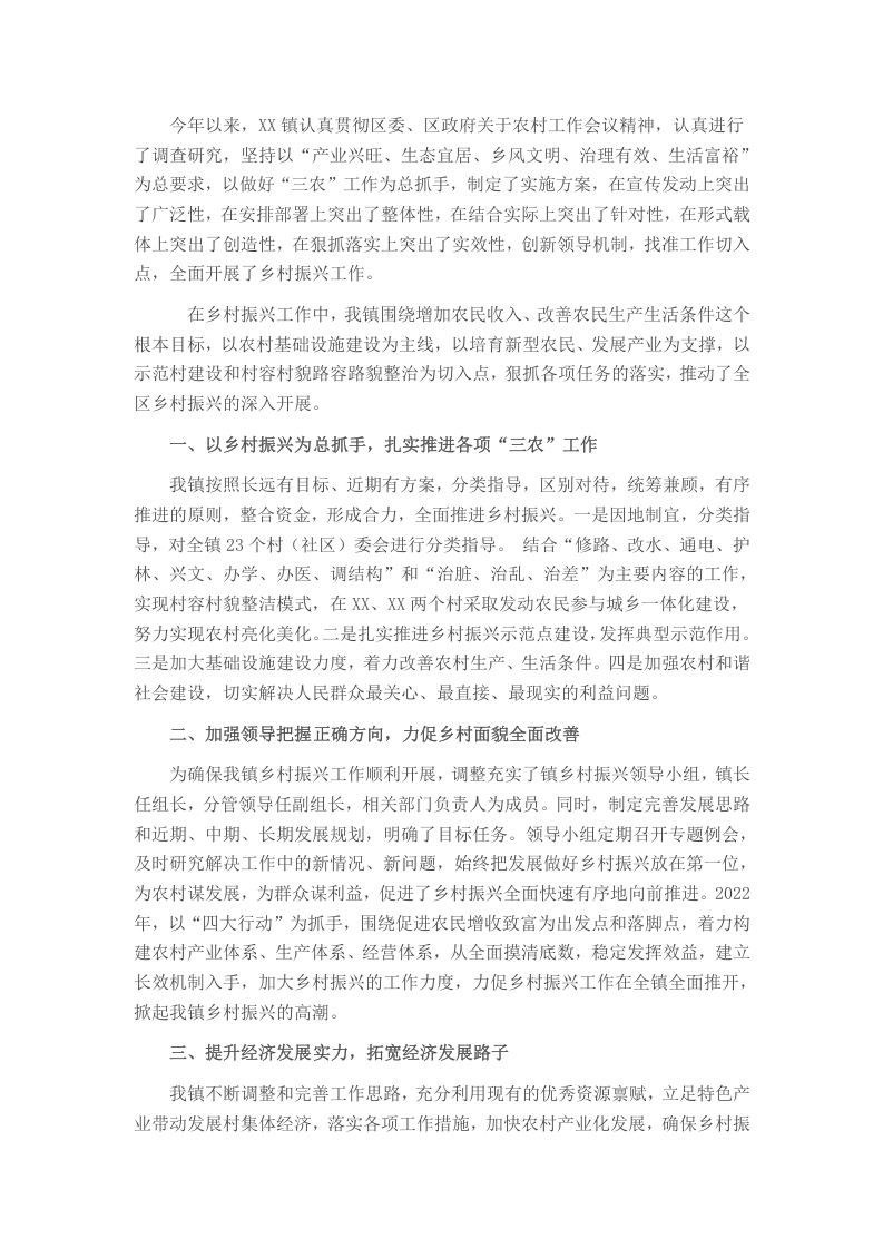 今年以来,XX镇认真贯彻区委、区政府关于农村工作会议精神,认真进行了调查研究,坚持以“产业兴旺、生态宜居、乡风文明、治理有效、生活富裕”为总要求,以做好“三农”工作为总抓手,制定了实施方案,在宣传发动上突出了广泛性,在安排部署上突出了整体性,在结合实际上突出了针对性,在形式载体上突出了创造性,在狠抓落实上突出了实效性,创新领导机制,找准工作切入点,全面开展了乡村振兴工作。在乡村振兴工作中,我镇围绕增加农民收入、改善农民生产生活条件这个根本目标,以农村基础设施建设为主线,以培育新型农民、发展产业为支撑,以示范村建设和村容村貌路容路貌整治为切入点,狠抓各项任务的落实,推动了全区乡村振兴的深入开展。一、以乡村振兴为总抓手,扎实推进各项“三农”工作我镇按照长远有目标、近期有方案,分类指导,区别对待,统筹兼顾,有序推进的原则,整合资金,形成合力,全面推进乡村振兴。一是因地制宜,分类指导,对全镇23个村(社区)委会进行分类指导。结合“修路、改水、通电、护林、兴文、办学、办医、调结构”和“治脏、治乱、治差”为主要内容的工作,实现村容村貌整洁模式,在XX、XX两个村采取发动农民参与城乡一体化建设,努力实现农村亮化美化。二是扎实推进乡村振兴示范点建设,发挥典型示范作用。三是加大基础设施建设力度,着力改善农村生产、生活条件。四是加强农村和谐社会建设,切实解决人民群众最关心、最直接、最现实的利益问题。二、加强领导把握正确方向,力促乡村面貌全面改善为确保我镇乡村振兴工作顺利开展,调整充实了镇乡村振兴领导小组,镇长任组长,分管领导任副组长,相关部门负责人为成员。同时,制定完善发展思路和近期、中期、长期发展规划,明确了目标任务。领导小组定期召开专题例会,及时研究解决工作中的新情况、新问题,始终把发展做好乡村振兴放在第一位,为农村谋发展,为群众谋利益,促进了乡村振兴全面快速有序地向前推进。2022年,以“四大行动”为抓手,围绕促进农民增收致富为出发点和落脚点,着力构建农村产业体系、生产体系、经营体系,从全面摸清底数,稳定发挥效益,建立长效机制入手,加大乡村振兴的工作力度,力促乡村振兴工作在全镇全面推开,掀起我镇乡村振兴的高潮。三、提升经济发展实力,拓宽经济发展路子我镇不断调整和完善工作思路,充分利用现有的优秀资源禀赋,立足特色产业带动发展村集体经济,落实各项工作措施,加快农村产业化发展,确保乡村振兴稳步推进,培育支撑产业,增加农民收入,壮大集体经济健康、协调、可持续发展。今年以来,结合上级新要求,我镇把产业项目谋划与村集体经济强村发展相结合、与乡村特色产业发展壮大提升相结合、与现代农业经营主体和龙头企业发展带动相结合、与扶贫产业园建设相结合,促进特色产业发展壮大,全镇累计投入衔接资金80万元,安排项目22个,其中产业类项目10个。同时,今年重点支持XX村壮大村集体经济发展产业项目,为村集体经济发展提供强大后劲。四、存在的问题和困难一是部分党员干部对乡村振兴的认识不高,加快发展的紧迫感和责任感不强,农民缺乏参与意识,“等、靠、要”的思想严重。同时,人的观念尚未彻底转变。虽然经过一年的思想教化,就干部而言,作风得到了好转,但因年龄、知识结构等方面的制约,发展经济的人才还是短缺。二是乡村振兴投入不足,农村基础设施脆弱,公共服务能力不强,加快农业发展的后劲不足。项目资金整合不好操作,乡镇、集体、农民经济匮乏,投入困难,制约着乡村振兴的进程。项目资金利用率不高,特别是在整合资金、捆绑使用方面办法不多,思路不宽,造成资金分散,项目效益难以发挥。项目建设投资力度不足、建设资金缺乏、融资难度较大。加之,项目督促、协调不够,影响了乡村振兴战略的顺利推进。五、下一步工作安排1.要切实发挥好“党委统一领导、党政群齐抓共管、单位积极配合、村(居)干部群众主动参与”的工作机制,加强领导、强化协调,精心组织、周密安排确保乡村振兴各项措施落到实处,真正把乡村振兴抓实抓细,抓出成效。2.进一步加大宣传力度。及时总结和宣传乡村振兴的先进典型和经验,扩大乡村振兴的影响力和感染力,使乡村振兴的目标口号上街上墙、进村入户,做到乡村振兴家喻户晓、人人皆知。着力抓好示范村建设工作。打造乡村振兴的“亮点”和“看点”。举办各类农民培训班,有计划、有组织、针对性地提供农民素质为产业链向两头延伸提供科技支撑。3.按照各级对乡村振兴的要求,坚持统一规划,分步实施,突出重点,整体推进,通过乡村振兴实现基层党组织战斗堡垒作用充分发挥,党员先锋模范作用切实体现,村民自我管理、自我教育、自我服务更加完善,各种制度建立健全,农民收入稳步增长,村级集体经济发展壮大,村容村貌明显改观,村民素质明显提高,村风民俗文明进步,社会环境安定有序。