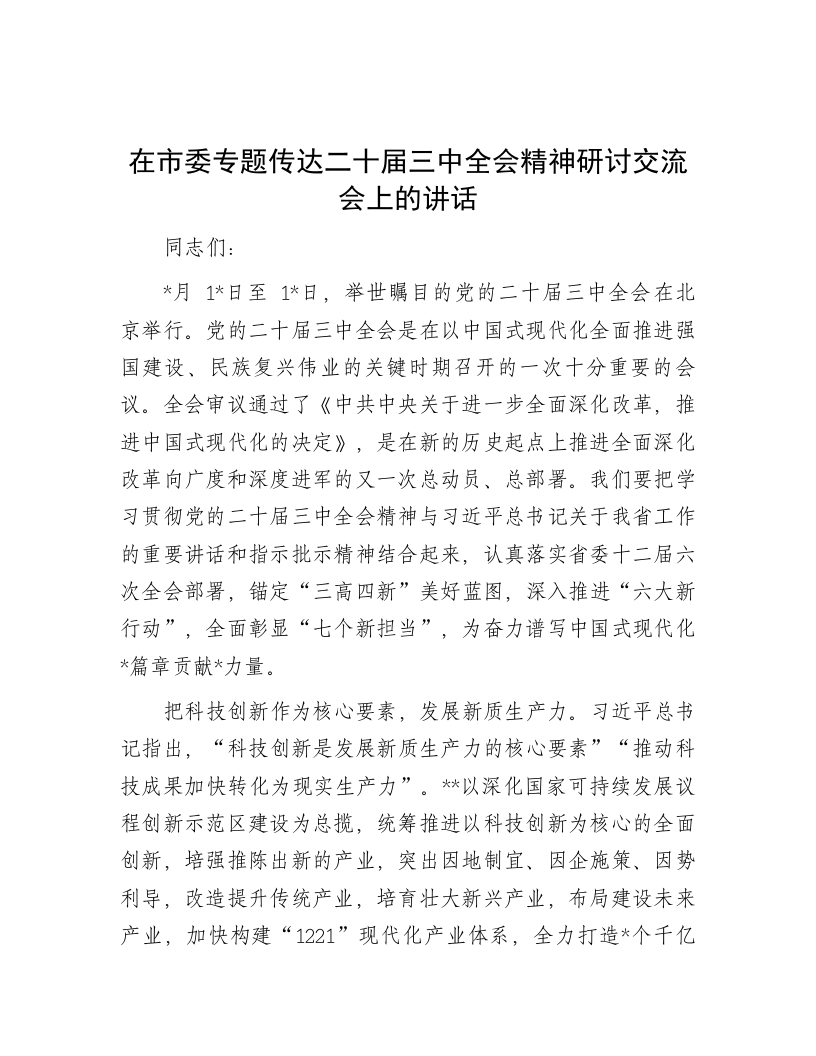 在市委专题传达二十届三中全会精神研讨交流会上的讲话