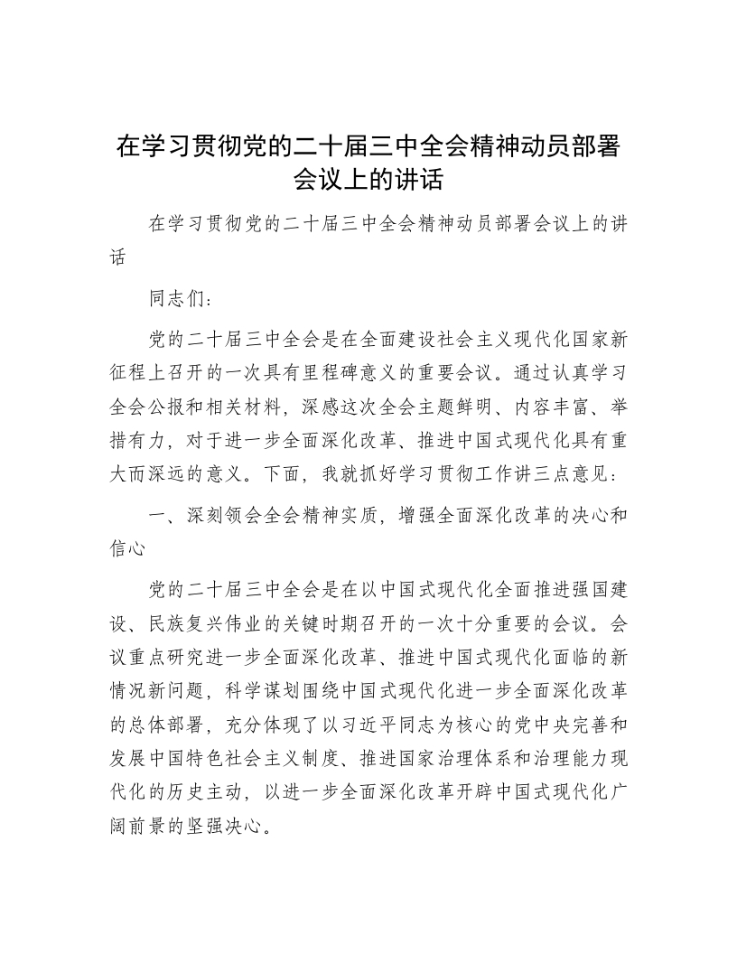 首页讲话合集在学习贯彻党的二十届三中全会精神动员部署会议上的讲话