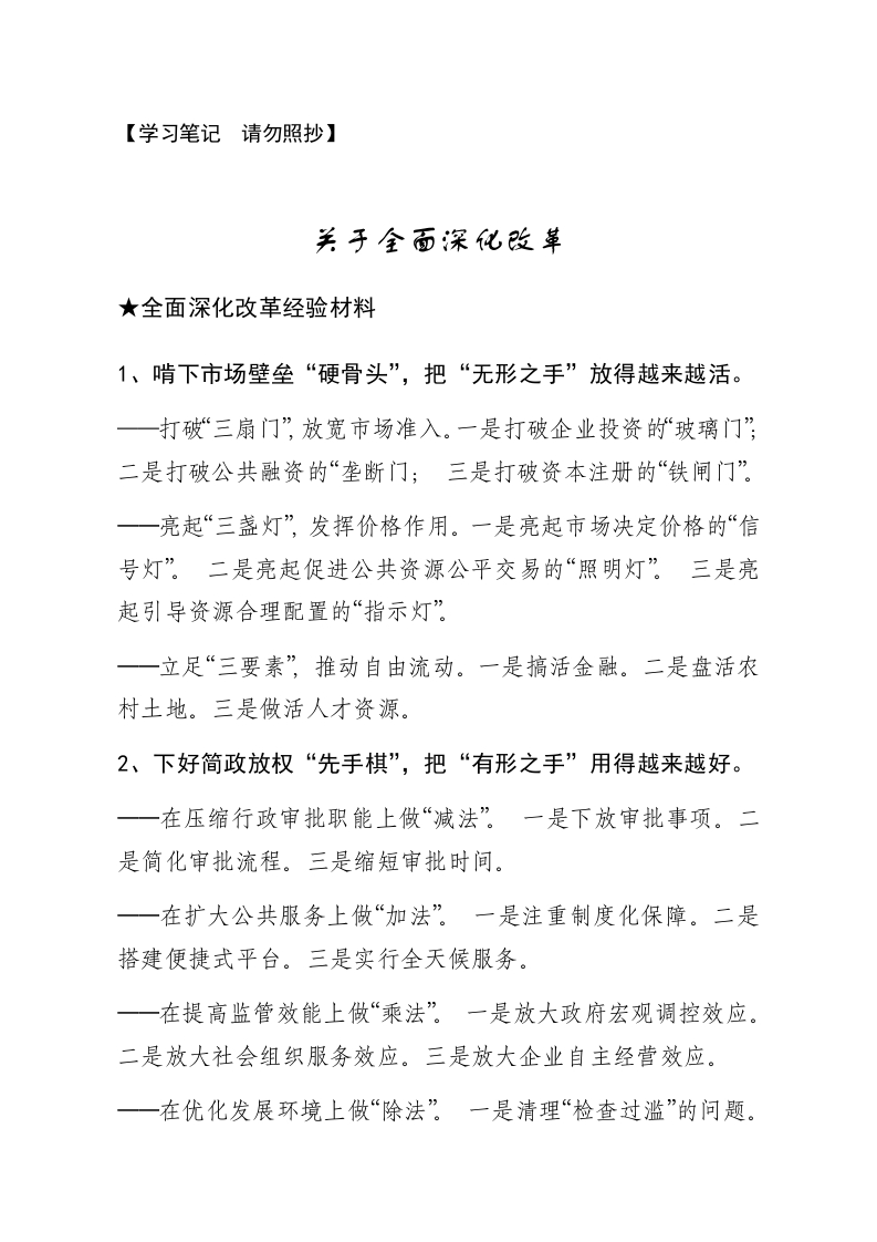 【学习笔记请勿照抄】关于全面深化改革★全面深化改革经验材料1、啃下市场壁垒“硬骨头”,把“无形之手”放得越来越活。一打破“三扇门”放宽市场准入。一是打破企业投资的玻璃门”;二是打破公共融资的“垄断门;三是打破资本注册的“铁闸门”一一亮起“三盏灯”,发挥价格作用。一是亮起市场决定价格的“信号灯”。二是亮起促进公共资源公平交易的“照明灯”三是亮起引导资源合理配置的“指示灯一立足“三要素”推动自由流动。一是搞活金融。二是盘活农村土地。三是做活人才资源。2、下好简政放权“先手棋”,把“有形之手”用得越来越好。一在压缩行政审批职能上做“减法”。一是下放审批事项。二是简化审批流程。三是缩短审批时间。一在扩大公共服务上做“加法”。一是注重制度化保障。二是搭建便捷式平台。三是实行全天候服务。一在提高监管效能上做“乘法”。一是放大政府宏观调控效应。二是放大社会组织服务效应。三是放大企业自主经营效应。一在优化发展环境上做“除法。一是清理“检查过滥”的问题。二是清理“执法过乱”的问题。三是清理“负担过重”的问题。3、立足“一带一部”新定位,把“开放之手”舞得越来越顺。一打开对接长江经济带的“通道”一是对接国家“一路一带”这个对外开放的大战略。二是对接上海这个长江经济带的“大口岸”。三是对接长江中游城市群这个新的增长极。降低外资准入的“门槛”一擦亮走出去的“名片”★全面深化改革经验材料账本“公开化”预算“全口径省与市县“确权”一省为市县“减负”省对市县“预警”一在整合和规范上着力,集中财力办大事。在联动和盘活上改进,避免资金闲置。一在监督和绩效上出招,把有限的资金用在“刀刃”上。★全面深化改革经验材料