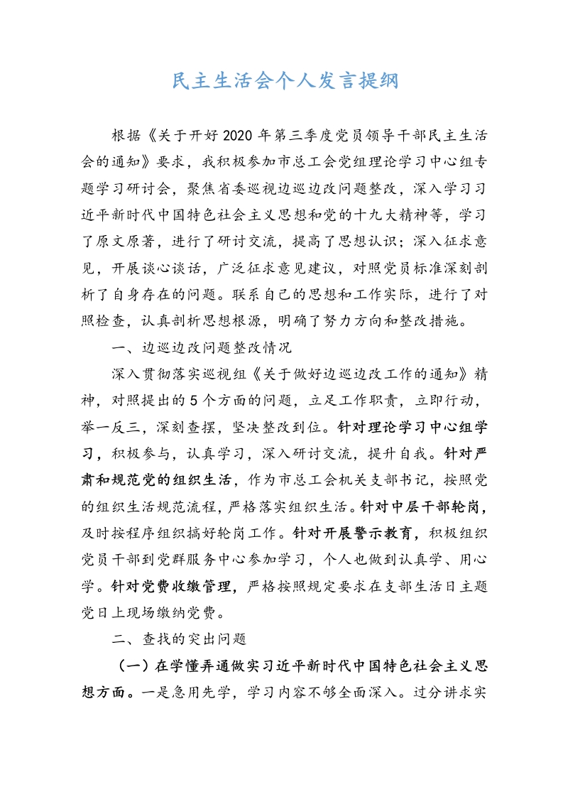 民主生活会个人发言提纲根据《关于开好2020年第三季度党员领导干部民主生活会的通知》要求,我积极参加市总工会党组理论学习中心组专题学习研讨会,聚焦省委巡视边巡边改问题整改,深入学习习近平新时代中国特色社会主义思想和党的十九大精神等,学习了原文原著,进行了研讨交流,提高了思想认识;深入征求意见,开展谈心谈话,广泛征求意见建议,对照党员标准深刻剖析了自身存在的问题。联系自己的思想和工作实际,进行了对照检查,认真剖析思想根源,明确了努力方向和整改措施。一、边巡边改问题整改情况深入贯彻落实巡视组《关于做好边巡边改工作的通知》精神,对照提出的5个方面的问题,立足工作职责,立即行动,举一反三,深刻查摆,坚决整改到位。针对理论学习中心组学习,积极参与,认真学习,深入研讨交流,提升自我。针对严肃和规范党的组织生活,作为市总工会机关支部书记,按照党的组织生活规范流程,严格落实组织生活。针对中层干部轮岗,及时按程序组织搞好轮岗工作。针对开展警示教育,积极组织党员千部到党群服务中心参加学习,个人也做到认真学、用心学。针对党费收缴管理,严格按照规定要求在支部生活日主题党日上现场缴纳党费。二、查找的突出问题(一)在学懂弄通做实习近平新时代中国特色社会主义思想方面。一是急用先学,学习内容不够全面深入。过分讲求实用性,对于习近平总书记关于工人阶级和工会工作的重要论述,学得多,悟得深,领会得透。与工会业务工作结合不够紧密的领域,如习近平总书记关于军队建设、外交国防、民族宗教等方面,仅仅是翻翻报纸、看看新闻,大致了解,知其然不知其所以然。二是理论与实践结合不够紧密,没有做到学以致用。运用习近平总书记党建理论指导机关支部党的建设结合不够紧密,比如,抓党建工作突破性项目力不从心,没有找准工作的切入点和突破点,推动工作成效不大;运用习近平总书记生态文明思想指导打好污染防治攻坚战,往往停留在较低层面,满足于开会部署、发发文件,简单的搞几次志愿服务活动:运用习近平总书记关于工人阶级和工会工作的重要论述指导工会工作,还没有真正破题,离“让职工群众真正感受到工会是职工之家,工会千部是最可信赖的娘家人”的要求,还有不小差距。三是,贯彻落实没有做到一抓到底。在开展党的十九大精神集中宣讲,武装干部职工头脑,把党的意志和主张转化为广大职工的自觉行动方面,没有一抓到底,推动十九大精神进企业、进车间、进班组方面,还有不小的提升空间。(二)在严格落实意识形态责任制方面。一是在抓意识形态工作上,往往注重在重大节日、重大活动的关键节点上真抓实干,平时抓的不紧、抓的不严,如五一集中劳模宣传,十一前集中庆祝新中国成立等抓得比较好,平时抓得不够紧;二是抓意识形态对象多为机关党员干部,面向全市职工的意识形态活动偏少。三是开展意识形态活动形式单一,会议形式偏多。