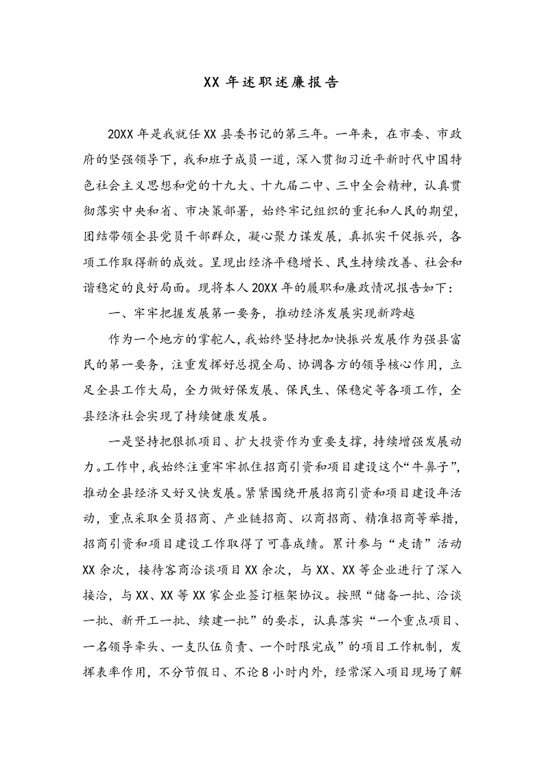 XX年述职述廉报告20XX年是我就任X县委书记的第三年。一年来,在市委、市政府的坚强领导下,我和班子成员一道,深入贯彻习近平新时代中国特色社会主义思想和党的十九大、十九届二中、三中全会精神,认真贯彻落实中央和省、市决策部署,始终牢记组织的重托和人民的期望,团结带领全县党员干部群众,凝心聚力谋发展,真抓实干促振兴,各项工作取得新的成效。呈现出经济平稳增长、民生持续改善、社会和谐稳定的良好局面。现将本人20XX年的履职和廉政情况报告如下:一、牢牢把握发展第一要务,推动经济发展实现新跨越作为一个地方的掌舵人,我始终坚持把加快振兴发展作为强县富民的第一要务,注重发挥好总揽全局、协调各方的领导核心作用,立足全县工作大局,全力做好保发展、保民生、保稳定等各项工作,全县经济社会实现了持续健康发展。一是坚持把狠抓项目、扩大投资作为重要支撑,持续增强发展动力。工作中,我始终注重牢牢抓住招商引资和项目建设这个“牛鼻子”,推动全县经济又好又快发展。紧紧围绕开展招商引资和项目建设年活动,重点采取全员招商、产业链招商、以商招商、精准招商等举措,招商引资和项目建设工作取得了可喜成绩。累计参与“走请”活动X余次,接待客商洽谈项目X余次,与X、X等企业进行了深入接洽,与X、X等X家企业签订框架协议。按照“储备一批、洽谈一批、新开工一批、续建一批”的要求,认真落实“一个重点项目、一名领导牵头、一支队伍负责、一个时限完成”的项目工作机制,发挥表率作用,不分节假日、不论8小时内外,经常深入项目现场了解情况,主持召开项目协调会,逐一扫除项目建设障碍,推动项目加快进度。全年储备项目X个、洽谈项目X个、新开工项目X个、续建项目X个。XX、XX等项目XX个正在加紧建设。X、X等X个项目即将建成投产。全年共引进项目X个,域外引资X亿元,实际利用外资X万美元,全市综合排名位居前列。积极扶持X、X等重点出口企业做大做强,全年实现出口创汇X万美元。认真贯彻落实中央7号文件精神,积极争取上级资金,推进PPP模式运作,累计包装项目X个,其中,纳入中央、省预算内项目X个;X个PPP项目纳入国家项目库,总投资达到X亿元。不断拓宽投融资渠道,争取各类融资贷款X亿元。二是坚持把调整结构、提高质量作为重要任务,着力提升产业整体水平。始终坚持产业强县不动摇,突出调整结构与优化升级并举、提质增效与扩增总量并重,做强支柱产业、做大新兴产业、改造传统产业。在促进工业转型提质上。持之以恒抓工业、扩总量、提质量、增效益,启动实施“《中国制造2025》提升工程”,加快发展先进制造业,培育以X、X为核心的半导体硅材料产业不断发展壮大。加快医药产业发展,积极推进X扩能、X等重点项目。推动工业化与信息化深度融合,全年实施技改项目X个。认真落实“稳增长工程”,推进X、X等项目尽快建成达产。积极帮助企业争取专项奖补资金和直购电政策,搭建政银企对接平台,加快工业大数据服务平台建设,千方百计促进企业降本、提质、增效。全年培育规模以上工业企业X户。在促进服务业提档升级上。经常深入企业和市场调研走访,了解经营状况,重点扶持文化旅游、现代服务业和总部经济等新型业态。着力构建以X文创城为核心的文化商业街区,继续推进X,加