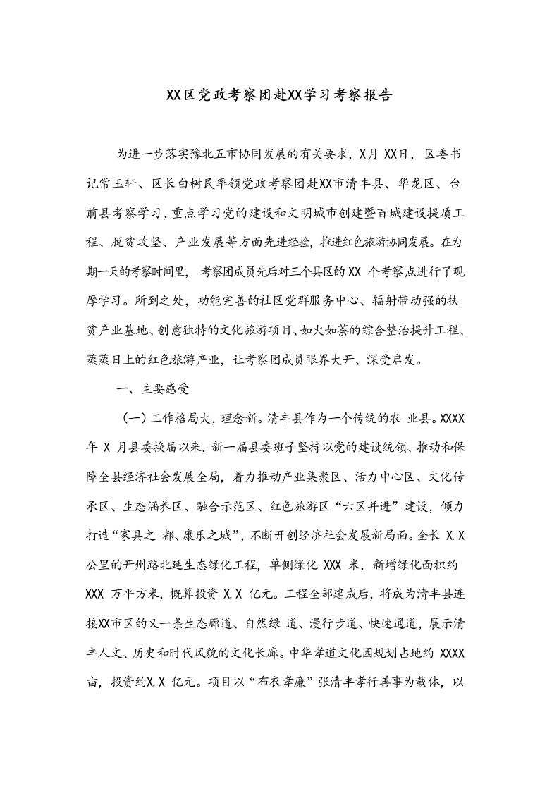 X区党政考察团赴X学习考察报告为进一步落实豫北五市协同发展的有关要求,X月X日,区委书记常玉轩、区长白树民率领党政考察团赴X市清丰县、华龙区、台前县考察学习,重,点学习党的建设和文明城市创建暨百城建设提质工程、脱贫攻坚、产业发展等方面先进经验,推进红色旅游协同发展。在为期一天的考察时间里,考察团成员先后对三个县区的X个考察点进行了观摩学习。所到之处,功能完善的社区党群服务中心、辐射带动强的扶贫产业基地、创意独特的文化旅游项目、如火如茶的综合整治提升工程、蒸蒸日上的红色旅游产业,让考察团成员眼界大开、深受启发。一、主要感受(一)工作格局大,理念新。清丰县作为一个传统的农业县。XXX年X月县委换届以来,新一届县委班子坚持以党的建设统领、推动和保障全县经济社会发展全局,着力推动产业集聚区、活力中心区、文化传承区、生态涵养区、融合示范区、红色旅游区“六区并进”建设,倾力打造“家具之都、康乐之城”,不断开创经济社会发展新局面。全长义X公里的开州路北延生态绿化工程,单侧绿化XX米,新增绿化面积约XX万平方米,概算投资XX亿元。工程全部建成后,将成为清丰县连接拟市区的又一条生态廊道、自然绿道、漫行步道、快速通道,展示清丰人文、历史和时代风貌的文化长廊。中华孝道文化园规划占地约XXX亩,投资约XX亿元。项目以“布衣孝廉”张清丰孝行善事为载体,以“传承孝道文化,弘扬孝道精神”为主题,以“一林一溪一道,两环八园十八景”为框架,以建设海绵城市为目标,强化城市绿肺功能,改善生态环境,推动新型生态旅游,提升城市品位。公园建成之后不仅是“爱国、爱家、爱社会”的全民道德教育基地,也是一处集文化传承、居民休闲、健身旅游为一体的公益事业和民生工程。华龙区坚持优化业态抓三产、转型升级抓二产、彰显特色抓一产、城乡统筹抓建设、实实在在抓民生、社会治理促和谐发展思路,推动经济社会全面健康快速发展。在推进百城建设提质工程过程中,该区坚持发展城市与管理城市并重,着力推进城乡一体化均衡发展。承接市政重,点工程拆迁项目X以上,XX国道改造提升、奥林匹克公园等双个重,点项目完成拆迁X万平方米。其中,XX国道综合提升工程,涉及X个村,两侧区域分布着XX家企业、大杂院和沿街门店,是X市建市以来最大的单体拆迁项目。正在建设的东北庄野生动物园,占地XXX亩,以生态、环保、科普、刺激为主题,总驯(饲)养各种动物X种、Xx只以上,建成之后,将成为周边XX公里内珍贵濒危动物种类最多、动物品种最多和平原地区占地面积最大的野生动物园。台前县致力于打赢脱贫攻坚战,积极引进华电集团,投资建设了总投资X亿元的华电台前XX兆瓦农光互补光伏发电项目。项目占地X以亩,规划装机容量为XX兆瓦,是全国X个容量达到XX兆瓦的大型光伏扶贫项目之一,也是河南省唯一一个。项户贫困户,连续X年实现年均XXX元的收益,真正实现产业发展助