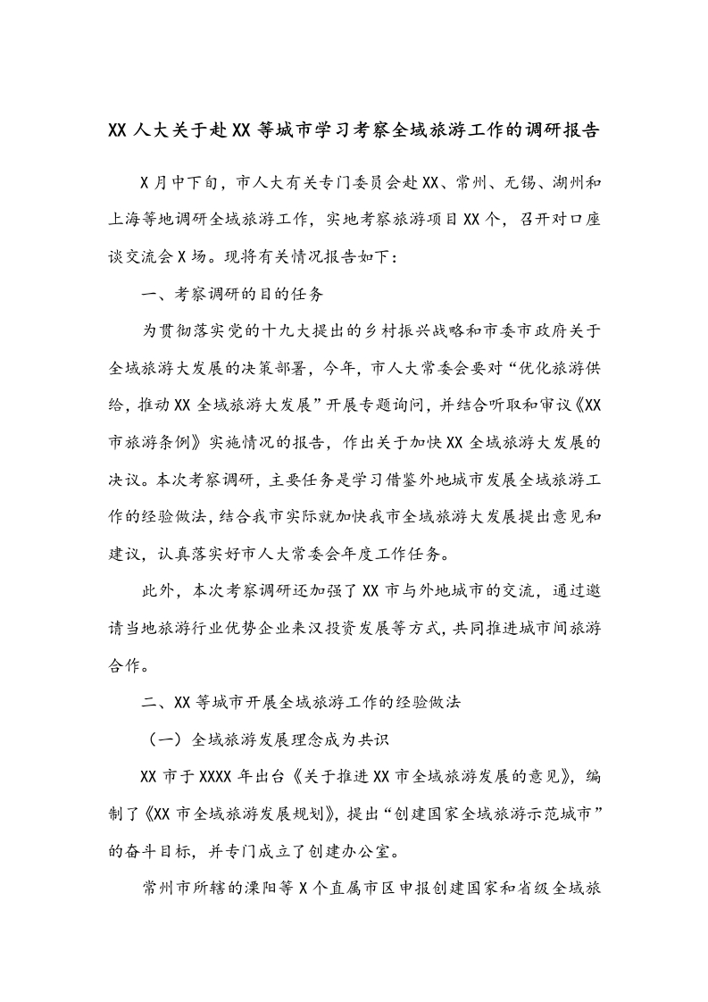 X人大关于赴X等城市学习考察全域旅游工作的调研报告X月中下旬,市人大有关专门委员会赴X、常州、无锡、湖州和上海等地调研全域旅游工作,实地考察旅游项目X个,召开对口座谈交流会X场。现将有关情况报告如下:一、考察调研的目的任务为贯彻落实党的十九大提出的乡村振兴战略和市委市政府关于全域旅游大发展的决策部署,今年,市人大常委会要对“优化旅游供给,推动X全域旅游大发展”开展专题询问,并结合听取和审议《XX市旅游条例》实施情况的报告,作出关于加快X全域旅游大发展的决议。本次考察调研,主要任务是学习借鉴外地城市发展全域旅游工作的经验做法,结合我市实际就加快我市全域旅游大发展提出意见和建议,认真落实好市人大常委会年度工作任务。此外,本次考察调研还加强了X市与外地城市的交流,通过邀请当地旅游行业优势企业来汉投资发展等方式,共同推进城市间旅游合作。二、X等城市开展全域旅游工作的经验做法(一)全域旅游发展理念成为共识XX市于XXX年出台《关于推进X市全域旅游发展的意见》,编制了《XX市全域旅游发展规划》,提出“创建国家全域旅游示范城市”的奋斗目标,并专门成立了创建办公室。常州市所辖的溧阳等X个直属市区申报创建国家和省级全域旅游示范区,当地政府高度重视,均将该项工作列入政府工作报告并编制了《全域旅游总体规划》。无锡市于XXX年XX月召开全市旅游发展大会暨国家全域旅游示范区创建工作动员大会,提出“把无锡打造成为省内领先、全国一流、世界知名的旅游目的地城市”目标,出台《关于创建国家全域旅游示范区的意见》、《推进无锡市旅游供给侧结构性改革促进国家全域旅游示范区发展XXX-XXX三年行动计划》,启动了旅游管理体制改革,进一步加大对旅游产业发展政策扶持力度。湖州市XXX年出台国家旅游业改革创新先行区建设和国家全域旅游示范区创建两个实施方案,提出“打造国家一流全域旅游示范区和国际生态休闲度假城市”的奋斗目标。在行政体制改革方面,不仅成立了湖州市旅游委,市编办还专门批复成立市公安局旅游警察支队、市市场监督管理局旅游分局等机构,“X+X+N”旅游行政管理体制改革取得实质性进展。此外,在旅游用地、产业融合、旅游统计、多规合一、公共服务、乡村旅游、滨湖度假等方面,出台了一系列扶持政策措施,旅游事业得到长足发展。(二)注重发挥国有旅游投资企业作用X市在夫子庙改扩建江南贡院,并在原江南贡院以地下X层结构建成中国科举博物馆。该改扩建工程全部由财政资金投资建设,建设后由国有公司运营管理,确保高质量、高档次和高品牌。无锡市按照现代企业制度模式,市政府和市国联集团、市政公用产业集团、太湖新城集团共同出资,以市直属公园景区为主体,整合