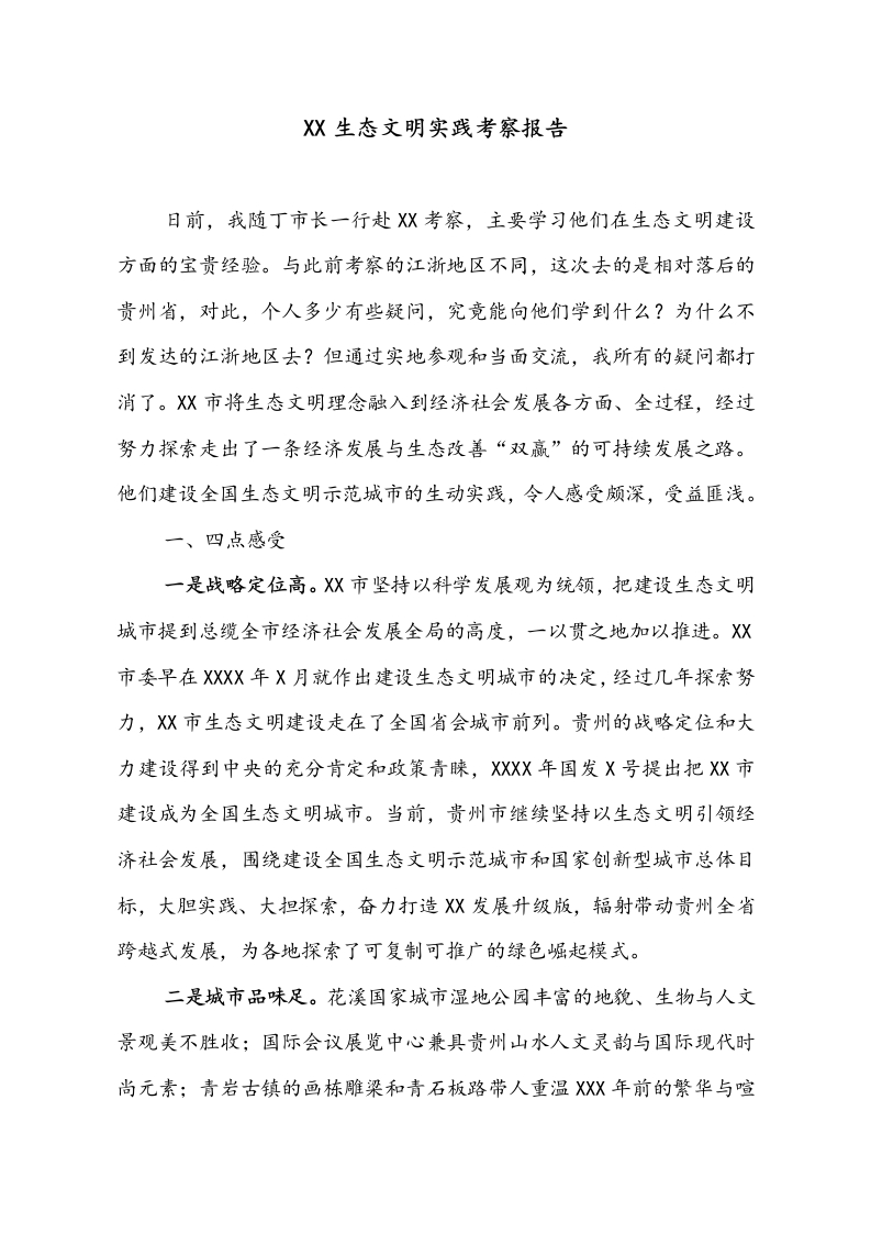 X生态文明实践考察报告日前,我随丁市长一行赴X考察,主要学习他们在生态文明建设方面的宝贵经验。与此前考察的江浙地区不同,这次去的是相对落后的贵州省,对此,个人多少有些疑问,究竟能向他们学到什么?为什么不到发达的江浙地区去?但通过实地参观和当面交流,我所有的疑问都打消了。X市将生态文明理念融入到经济社会发展各方面、全过程,经过努力探索走出了一条经济发展与生态改善“双赢”的可持续发展之路。他们建设全国生态文明示范城市的生动实践,令人感受颇深,受益匪浅。一、四点感受一是战略定位高。X市坚持以科学发展观为统领,把建设生态文明城市提到总缆全市经济社会发展全局的高度,一以贯之地加以推进。X市委早在XXX年X月就作出建设生态文明城市的决定,经过几年探索努力,X市生态文明建设走在了全国省会城市前列。贵州的战略定位和大力建设得到中央的充分肯定和政策青睐,XXX年国发X号提出把X市建设成为全国生态文明城市。当前,贵州市继续坚持以生态文明引领经济社会发展,围绕建设全国生态文明示范城市和国家创新型城市总体目标,大胆实践、大担探索,奋力打造X发展升级版,辐射带动贵州全省跨越式发展,为各地探索了可复制可推广的绿色崛起模式。二是城市品味足。花溪国家城市湿地公园丰富的地貌、生物与人文景观美不胜收:国际会议展览中心兼具贵州山水人文灵韵与国际现代时尚元素;青岩古镇的画栋雕梁和青石板路带人重温XXX年前的繁华与喧嚣:孔学堂设计大胆创新,成为独一无二传承儒学的圣殿、开启新风的基地。富士康示范工厂集商品销售、展示、体验及工业生产为一体,能让顾客亲眼见到所消费产品的生产过程,体验其中蕴含的科技含量:XX大数据展示中心给人“穿越时空”的玄幻,X云计算中心把贵州的传统产业、新兴产业直接送入云端。这一切给人勾勒出一个自然古朴而有现代时尚的“爽爽贵州”。三是绿色氛围浓。生态文明的理念浓厚,从党政千部到企业员工到社区群众无不明白“绿色”的重大意义。从XXX年底当时的X市委书记就提出,“生态环境是X最大的本钱、最大的希望”。X通过举办生态文明城市领导千部研讨班、培训班等多种方式凝聚干部的“绿色”共识。从XXX年开始,X编辑出版生态文明城市建设学生读本、市民读本,开设生态文明课和市民学校,让生态文明理念入脑入心全覆盖。尤其是自XXX年开始,X连续X年举办生态文明XX会议,XXXX年升格为生态文明X国际论坛,先后形成X个X共识,为X注入新的时代文化内涵。四是发展速度快。抓生态文明建设不是不要发展,而是以绿色产业、绿色城镇、绿色消费引领可持续发展。XXXX年到XXX年,X主要经济指标增速在全国省会城市中名列前茅。GDP增速近三年分别为X.%、XX.X%、XX%,是全国增速的X倍。其中,XX国家高新区XXX年工业总产值、公共财政预算收入、固定资产投资同比分别增长X%、X.X%、X%,专利申请量、授权量分别为XXX件、XXX件。X森林覆盖率由X.XX%上升到X.%:饮用水源达标率XX%、污水处理率达到X.%:空气质