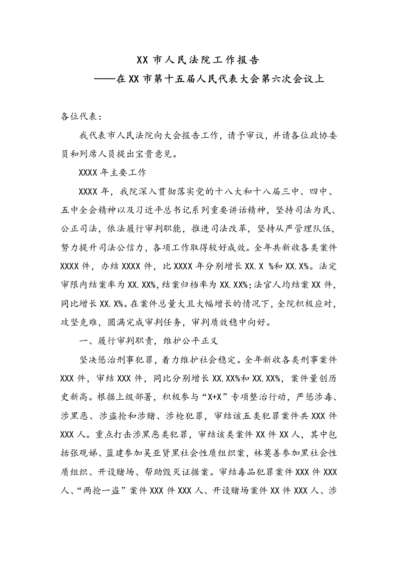 XX市人民法院工作报告一在X市第十五届人民代表大会第六次会议上各位代表:我代表市人民法院向大会报告工作,请予审议,并请各位政协委员和列席人员提出宝贵意见。XXXX年主要工作XXX年,我院深入贯彻落实党的十八大和十八届三中、四中、五中全会精神以及习近平总书记系列重要讲话精神,坚持司法为民、公正司法,依法履行审判职能,推进司法改革,坚持从严管理队伍,努力提升司法公信力,各项工作取得较好成效。全年共新收各类案件XXXX件,办结XXXX件,比XXXX年分别增长XX.X%和XX.X%。法定审限内结案率为X.X%,结案归档率为X.XX%:法官人均结案X件,同比增长X.%。在案件总量大且大幅增长的情况下,全院积极应对,攻坚克难,圆满完成审判任务,审判质效稳中向好。一、履行审判职责,维护公平正义坚决惩治刑事犯罪,着力维护社会稳定。全年新收各类刑事案件XXX件,审结XX件,同比分别增长XX.XX%和X.X%,案件量创历史新高。根据上级部署,积极参与“X+X”专项整治行动,严惩涉毒、涉黑恶、涉盗抢和涉赌、涉枪犯罪,审结该五类犯罪案件共XX件XX人。重点打击涉黑恶类犯罪,审结该类案件X件X人,其中包括张观娣、蓝建参加吴亚贤黑社会性质组织案,林莫善参加,黑社会性质组织、开设赌场、帮助毁灭证据案。审结毒品犯罪案件XX件XX人、“两抢一盗”案件XX件XX人、开设赌场案件X件XX人、涉枪犯罪案件X件X人。严惩危害食品药品安全犯罪,审结生产、销售假药案件X件X人。严惩电信网络犯罪,审结李耀军等X人利用互联网诈骗案和吴虹等X人利用互联网开设赌场案。妥善化解民商事纠纷,着力优化发展环境。全年新收各类民商事案件XXX件,审结XXX件,同比分别增长X.XX%和X.X%。其中审结婚姻家庭及继承纠纷案XX件,促进家庭和睦;审结买卖、借款、电信、保险等合同纠纷案XXX件,维护市场秩序:审结劳动争议案X件,通过调解方式为某水泥公司X名农民工讨回欠薪X.X万元、促使某化工公司与X名员工达成下岗补偿协议,弘扬诚信良俗;审结交通事故等涉及人身权、财产权损害责任纠纷案XX件,保护弱者群体:创新企业破产案件审理,第二水泥厂破产案已办结,财贸水泥厂、石城水泥厂等破产案件正在稳妥推进,助力经济发展。强化执行关键举措,着力兑现合法权益。全年新收各类执行案件XXXX件,执结XXX件,同比分别增长X.XX%和X.XX%。执结标的金额XXX亿元,实际执行率XXX%,执行标的到位率XX.X%。推进财产查控网络化、自动化建设,提高执行工作效率。组织开展涉民生案件、涉农信社案件等专项执行活动,执结欠薪和追索抚养费、赡养费等案件XX件;为农信社追回贷款金额XX万元。开展集中打击拒不执行法院生效裁判犯罪活动,向公安机关移送拒执刑事案X件;将XX多人录入全国法院失信被执行人名单库,对其予以信用惩戒。X宗案件因当事人被刑事立案或被列入失信名单而自觉履行。组织开展大型执行行动,成功执结车板镇龙头沙村民小组与部分村民土地纠纷、黎明农场与良垌镇平坡村民小组土地纠纷等十多宗涉群体案件。二、推进司法改革,完善科学机制