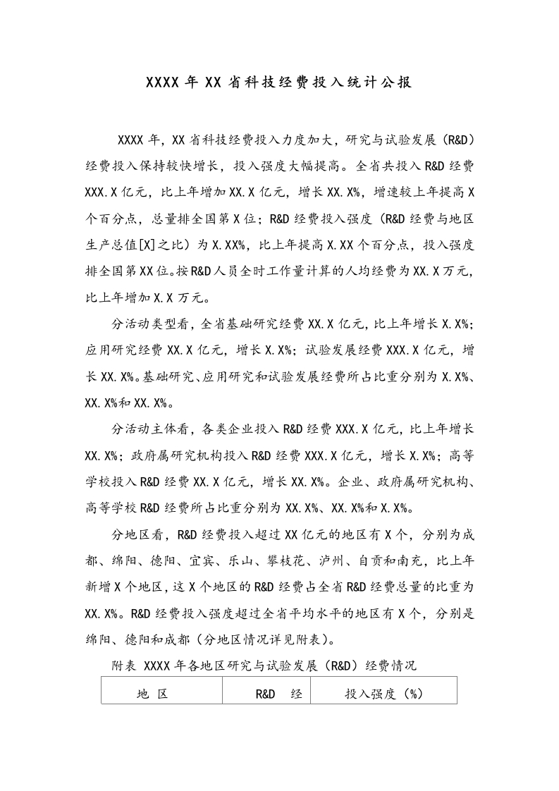 XXXX年XX省科技经费投入统计公报XXX年,X省科技经费投入力度加大,研究与试验发展(R&D)经费投入保持较快增长,投入强度大幅提高。全省共投入R&D经费XXX.X亿元,比上年增加X.X亿元,增长X.%,增速较上年提高X个百分点,总量排全国第X位;R&D经费投入强度(R&D经费与地区生产总值[X]之比)为X.XX%,比上年提高X.XX个百分点,投入强度排全国第XX位。按R&D人员全时工作量计算的人均经费为X.X万元,比上年增加X.X万元。分活动类型看,全省基础研究经费X.X亿元,比上年增长X.X%;应用研究经费XX.X亿元,增长X.X%:试验发展经费XX.X亿元,增长X.%。基础研究、应用研究和试验发展经费所占比重分别为X.X%、XX.X%和XX.X%。分活动主体看,各类企业投入R&D经费XXX.X亿元,比上年增长X.X%;政府属研究机构投入R&D经费XXX.X亿元,增长X.X%;高等学校投入R&D经费X.X亿元,增长X%。企业、政府属研究机构、高等学校R&D经费所占比重分别为XX.X%、XX.X%和X.X%。分地区看,R&D经费投入超过X亿元的地区有X个,分别为成都、绵阳、德阳、宜宾、乐山、攀枝花、泸州、自贡和南充,比上年新增X个地区,这X个地区的R&D经费占全省R&D经费总量的比重为X.%。R&D经费投入强度超过全省平均水平的地区有X个,分别是绵阳、德阳和成都(分地区情况详见附表)。附表XXX年各地区研究与试验发展(R&D)经费情况地区R&D经投入强度(%)费(亿元)成都XXX.XX.XX自贡XX.XX.XX攀枝花XX.XX.XX泸州XX.XX.XX德阳XX.XX.XX绵阳XXX.XX.XX广元X.XX.XX遂宁X.XX.XX内江X.XX.XX乐山XX.XX.XX南充XX.XX.XX眉山X.XX.XX宜宾XX.XX.XX广安X.XX.XX达州X.XX.XX雅安X.XX.XX巴中X.XX.XX资阳X.XX.XX阿坝X.XX.XX甘孜X.XX.XX凉山X.XX.XX附注: