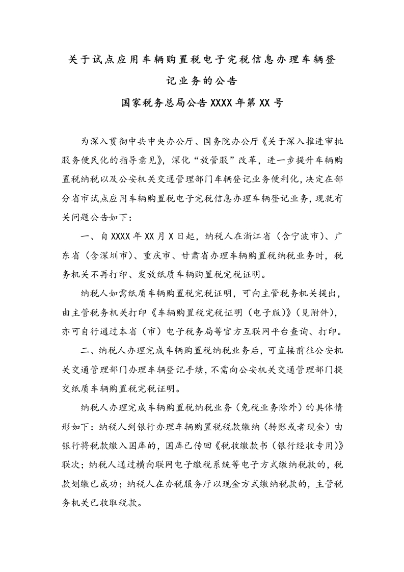 关于试点应用车辆购置税电子完税信息办理车辆登记业务的公告国家税务总局公告XXX年第x号为深入贯彻中共中央办公厅、国务院办公厅《关于深入推进审批服务便民化的指导意见》,深化“放管服”改革,进一步提升车辆购置税纳税以及公安机关交通管理部门车辆登记业务便利化,决定在部分省市试,点应用车辆购置税电子完税信息办理车辆登记业务,现就有关问题公告如下:一、自XXX年X月X日起,纳税人在浙江省(含宁波市)、广东省(含深圳市)、重庆市、甘肃省办理车辆购置税纳税业务时,税务机关不再打印、发放纸质车辆购置税完税证明。纳税人如需纸质车辆购置税完税证明,可向主管税务机关提出,由主管税务机关打印《车辆购置税完税证明(电子版)》(见附件),亦可自行通过本省(市)电子税务局等官方互联网平台查询、打印。二、纳税人办理完成车辆购置税纳税业务后,可直接前往公安机关交通管理部门办理车辆登记手续,不需向公安机关交通管理部门提交纸质车辆购置税完税证明。纳税人办理完成车辆购置税纳税业务(免税业务除外)的具体情形如下:纳税人到银行办理车辆购置税税款缴纳(转账或者现金)由银行将税款缴入国库的,国库已传回《税收缴款书(银行经收专用)》联次:纳税人通过横向联网电子缴税系统等电子方式缴纳税款的,税款划缴已成功:纳税人在办税服务厅以现金方式缴纳税款的,主管税务机关已收取税款。三、试点地区纳税人在XXX年X月X日以前(含X月X日)办理了车辆购置税纳税业务的,仍要凭借纸质车辆购置税完税证明到公安机关交通管理部门办理车辆登记业务。四、试点地区纳税人在XXX年X月X日以前(含X月X日)办理的车辆购置税纳税业务,如需在XXX年XX月X日以后(含X月X日)办理车辆购置税完税证明换证、补证业务,税务机关仍然出具纸质车辆购置税完税证明。五、试,点期间内在试,点地区办理了车辆购置税纳税业务的纳税人,可凭借《车辆购置税完税证明(电子版)》到非试,点地区税务部门办理相关业务。特此公告。附件:车辆购置税完税证明(电子版)国家税务总局公安部XXXX年XX月XX日免贡声明:图文来源网络征集,版权归原作者所有。若侵犯了您的合法权益,请作者持权属证明与本站联系,我们将及时更正、副除!谢谢!
