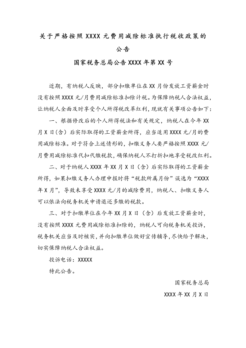 关于严格按照XXXX元费用减除标准执行税收政策的公告国家税务总局公告XXX年第X号近期,有纳税人反映,部分扣缴单位在X月份发放工资薪金时没有按照XXX元/月费用减除标准扣除计税。为保障纳税人合法权益,让纳税人全面及时享受个人所得税改革红利,现就有关事项公告如下:一、根据修改后的个人所得税法和有关规定,纳税人在今年X月X日(含)后实际取得的工资薪金所得,应当适用XXX元/月的费用减除标准。对于符合上述情形的,扣缴义务人要严格按照XXX元/月费用减除标准代扣代缴税款,确保纳税人不打折扣地享受税改红利。二、对于纳税人XXX年X月X日(含)后实际取得的工资薪金所得,如果扣缴义务人办理申报时将“税款所属月份”误选为“XXXX年X月”,导致未享受XXXX元/月的减除费用,纳税人、扣缴义务人可以依法向税务机关申请退还多缴的税款。三、对于扣缴单位在今年X月X日(含)后发放工资薪金时,没有按照XXX元费用减除标准扣除的,纳税人可向税务机关投诉,税务机关应当及时核实,并向扣缴单位做好宣传辅导,尽快给予解决,切实保障纳税人合法权益。投诉电话:XXXXX特此公告。国家税务总局XXXX年XX月X日免贡声明:图文来源网络征集,版权归原作者所有。若侵犯了您的合法权益,诗作者持权属证明与本站联系,我们将及时更正、删除!谢谢!