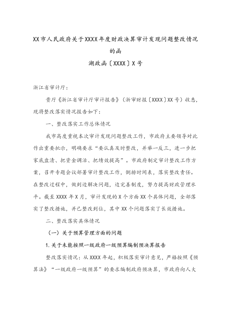 X市人民政府关于XXX年度财政决算审计发现问题整改情况的函湖政函〔XXX〕X号浙江省审计厅:贵厅《浙江省审计厅审计报告》(浙审财报〔XXX)X号)收悉,现将整改落实情况报告如下:一、整改落实工作总体情况我市高度重视本次审计发现问题整改工作,市政府主要领导对此作出重要批示,明确要求“要认真及时整改,并举一反三,进一步把家底盘清、把资金调活、把绩效提高”。市政府制定审计整改工作方案,召开专题会议部署审计整改工作,倒排时间表,落实整改责任。在整改过程中,做到边解决问题,边完善制度,努力提高财政管理水平。截至XXX年X月,审计发现的X个方面X个具体问题,全部落实了整改措施,并已整改到位,其中X个问题落实了长效措施。二、整改落实具体情况(一)关于预算管理方面的问题1.关于未能按照一级政府一级预算编制预决算报告整改落实情况:从XXX年起,积极落实审计意见,严格按照《预算法》“一级政府一级预算”的要求编制政府预决算,市政府向人大报告的预决算,除全市和市本级预决算外,增加报告市级财政预决算(范围包含市直与X开发区、太湖度假区,不包含吴兴区、南浔区)。2.关于一般公共预算支出预算X.X亿元不够细化整改落实情况:在编制XXX年预算时,进一步完善预算编制要求,细化预算编制。一是积极推进项目库建设,提前做好专项资金项目储备工作;二是除增人增资等方面外,严格控制年初预留项目:三是严格控制代编预算规模,提高年初预算到位率,切实把预算细化到部门,细化到基层单位。3.关于预算调整时间不合规整改落实情况:已整改到位,XXX年市级预算调整方案,按规定时间报经市人大常委会会议审查通过(批准决议详见附件X)。4.关于财政总决算会计报表未反映X个财政专户的资产负债情况整改落实情况:积极落实审计意见,上述财政专户资产负债情况,从XXX年开始,按照财政部、省财政厅关于财政总决算的编审要求,汇总编入年度财政总决算会计报表。(二)关于预算收入方面的问题1.关于X市本级应纳未纳一般公共预算XXX.X万元,影响省级收入XX.X万元整改落实情况:一是将历年国资收益等应作未作一般公共预算收入XXXX.X万元(影响省级收入XX.X万元),已按规定缴入国库(缴库凭证详见附件X);二是其他应纳未纳的XXX.XX万元收费收入,由