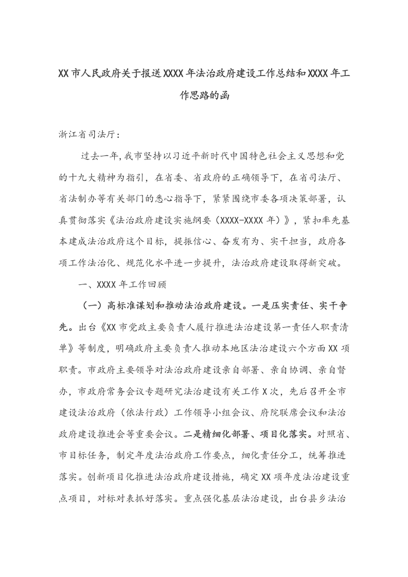 XX市人民政府关于报送XX年法治政府建设工作总结和XX年工作思路的函浙江省司法厅:过去一年,我市坚持以习近平新时代中国特色社会主义思想和党的十九大精神为指引,在省委、省政府的正确领导下,在省司法厅、省法制办等有关部门的悉心指导下,紧紧围绕市委各项决策部署,认真贯彻落实《法治政府建设实施纲要(XXXX-XXX年)》,紧扣率先基本建成法治政府这个目标,提振信心、奋发有为、实干担当,政府各项工作法治化、规范化水平进一步提升,法治政府建设取得新突破。一、XXX年工作回顾(一)高标准谋划和推动法治政府建设。一是压实责任、实干争先。出台《XX市党政主要负责人履行推进法治建设第一责任人职责清单》等制度,明确政府主要负责人推动本地区法治建设六个方面X项职责。市政府主要领导对法治政府建设亲自部署、亲自协调、亲自督办,市政府常务会议专题研究法治建设有关工作X次,先后召开全市建设法治政府(依法行政)工作领导小组会议、府院联席会议和法治政府建设推进会等重要会议。二是精细化部署、项目化落实。对照省、市目标任务,制定年度法治政府工作要,点,细化责任分工,统筹推进落实。创新项目化推进法治政府建设措施,确定X项年度法治建设重,点项目,对标对表抓好落实。重,点强化基层法治建设,出台县乡法治政府建设三年行动计划实施方案,基层法治基础不断夯实。三是严格督查、科学考核。坚持问题导向,精细化推动法治政府建设,优化区县综合考核和部门分类考核中法治政府建设标准,充分发挥考核评价对法治建设的“指挥棒”作用。聚焦抓重,点、补短板、强弱项,主动查找当前法治政府建设存在的短板,逐一走访排查,指导督促整改,逐项推进落实。定期召开法治政府建设考核分析会,落实按月督查、按季通报工作机制。(二)全面打好法治建设重点领域攻坚战。一是“最多跑一次”改革持续深化。出台“利民、惠企、提速”十五条意见,全部民生事项和企业事项实现“一次办结”,全部高频事项实现“一城一窗一网一证通办”,“最多跑一次”改革满意率居全省前列。工程建设项目审批制度改革稳步开展,组建全省首个工程建设项目中介联合体,一般企业投资项目开工前平均审批时间缩短至X天。涉企证照由市场监管部门通办改革经验在全省推广,常态化企业开办时间压缩至X个工作日。政府部门之间的“信息孤岛”逐步打破,累计归集X个部门XX亿条政务数据,通过让数据多跑路,实现了群众少跑腿。二是资源要素配置改革持续推进。坚持“亩均论英雄”,全面推进资源要素市场化配置。“标准地+承诺制+一窗代办”工作机制基本建立,省级以上平台工业用地全部按“标准地”模式出让,全市省级以上平台新增工业用地“标准地”出让占比数居全省第一。全面开展批而未供、供而未用、用而未尽、建而未投、投而未达标建设用地处置专项行动,我