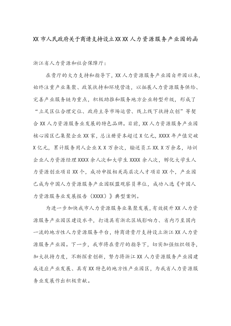 双市人民政府关于商请支持设立X双人力资源服务产业园的函浙江省人力资源和社会保障厅:在贵厅的大力支持和指导下,X人力资源服务产业园自开园以来,始终注重产业集聚、政策扶持和环境营造,以拓展人力资源服务供给、完善产业服务链为重点,积极助推和服务地方企业转型升级,形成了“立足区位合理定位、政府主导市场运营、线上线下扶持众创”等契合X人力资源服务业发展的特色品牌。目前,X人力资源服务产业园核心园区已集聚企业X家,总注册资本超过X亿元,XXX年产值突破X亿元,累计服务用人企业X.X万余次,输送员工X.X万余名,培训企业人力资源经理XXX余人次和大学生XXX余人次,孵化大学生人力资源创业项目X个,成功申报相关高层次人才项目X个,产业园已成为中国人力资源服务产业园联盟观察员单位,成功入选《中国人力资源服务业发展报告(XXXX)》典型案例。为进一步加快我市人力资源服务业集聚发展,有效提升X人力资源服务产业园区建设水平,打造具有浙北区域影响力、省内乃至国内一流的地方性人力资源服务平台,特商请贵厅支持设立浙江X人力资源服务产业园。下一步,我市将在贵厅的指导下,切实加强组织领导,加大扶持力度,不断探索创新,努力将浙江X人力资源服务产业园建成适应产业发展、具有X特色的地方性产业园区,为我省人力资源服务业发展作出积极贡献。特此致函,请予支持。XX市人民政府XXXX年XX月XX日X市人民政府办公室XXXX年XX月XX日印发免责声明:图文来源网络征集,版权归原作者所有。若侵犯了您的合法权益,请作者持权属证明与本站联系,我们将及时更正、删除!谢谢!