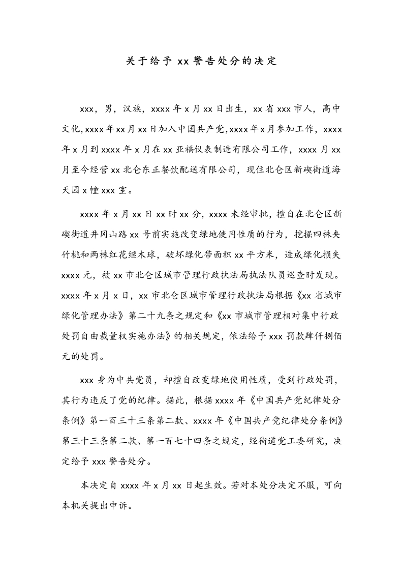 关于给予X×警告处分的决定月至今经营xx北仑东正餐饮配送有限公司,现住北仑区新碶街道海碶街道井冈山路x号前实施改变绿地使用性质的行为,挖掘四株夹竹桃和两株红花继木球,破坏绿化带面积Xx平方米,造成绿化损失XXX×元,被x市北仑区城市管理行政执法局执法队员巡查时发现。绿化管理办法》第二十九条之规定和《xx市城市管理相对集中行政处罚自由裁量权实施办法》的相关规定,依法给予XXx罚款肆仟捌佰元的处罚。xXx身为中共党员,却擅自改变绿地使用性质,受到行政处罚,其行为违反了党的纪律。据此,根据xxx×年《中国共产党纪律处分条例》第一百三十三条第二款、xxxx年《中国共产党纪律处分条例》第三十三条第二款、第一百七十四条之规定,经街道党工委研究,决本机关提出申诉。免贡声明:图文来源网络征集,版权归原作者所有。若侵犯了您的合法权益,请作者持权属证明与本站联系,我们将及时更正、删除!谢谢!