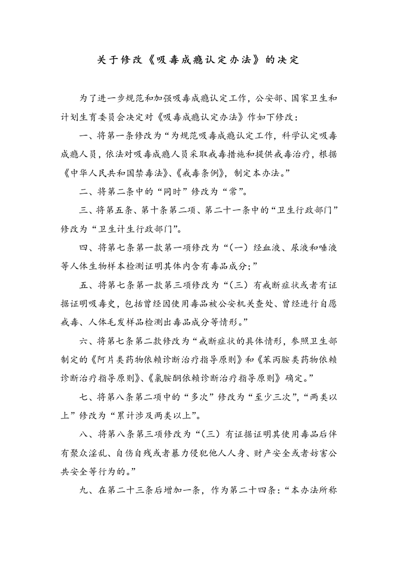 关于修改《吸毒成瘾认定办法》的决定为了进一步规范和加强吸毒成瘾认定工作,公安部、国家卫生和计划生育委员会决定对《吸毒成瘾认定办法》作如下修改:一、将第一条修改为“为规范吸毒成瘾认定工作,科学认定吸毒成瘾人员,依法对吸毒成瘾人员采取戒毒措施和提供戒毒治疗,根据《中华人民共和国禁毒法》、《戒毒条例》,制定本办法。”二、将第二条中的“同时”修改为“常”。三、将第五条、第十条第二项、第二十一条中的“卫生行政部门”修改为“卫生计生行政部门”。四、将第七条第一款第一项修改为“(一)经血液、尿液和唾液等人体生物样本检测证明其体内含有毒品成分:”五、将第七条第一款第三项修改为“(三)有戒断症状或者有证据证明吸毒史,包括曾经因使用毒品被公安机关查处、曾经进行自愿戒毒、人体毛发样品检测出毒品成分等情形。”六、将第七条第二款修改为“戒断症状的具体情形,参照卫生部制定的《阿片类药物依赖诊断治疗指导原则》和《苯丙胺类药物依赖诊断治疗指导原则》、《氯胺酮依赖诊断治疗指导原则》确定。”七、将第八条第二项中的“多次”修改为“至少三次”,“两类以上”修改为“累计涉及两类以上”。八、将第八条第三项修改为“(三)有证据证明其使用毒品后伴有聚众淫乱、自伤自残或者暴力侵犯他人人身、财产安全或者妨害公共安全等行为的。”九、在第二十三条后增加一条,作为第二十四条:“本办法所称的两类及以上毒品是指阿片类(包括鸦片、吗啡、海洛因、杜冷丁等),苯丙胺类(包括各类苯丙胺衍生物),大麻类,可卡因类,以及氯胺酮等其他类毒品。”《吸毒成瘾认定办法》的有关条文序号根据本决定作相应调整。本决定自20XX年X月X日起施行。公安部部长XXX卫生计生委主任XX20XX年XX月XX日免责声明:图文来源网络征集,版权归原作者所有。若侵犯了您的合法权益,请作者持权属证明与本站联系,我们将及时更正、副除!谢谢!