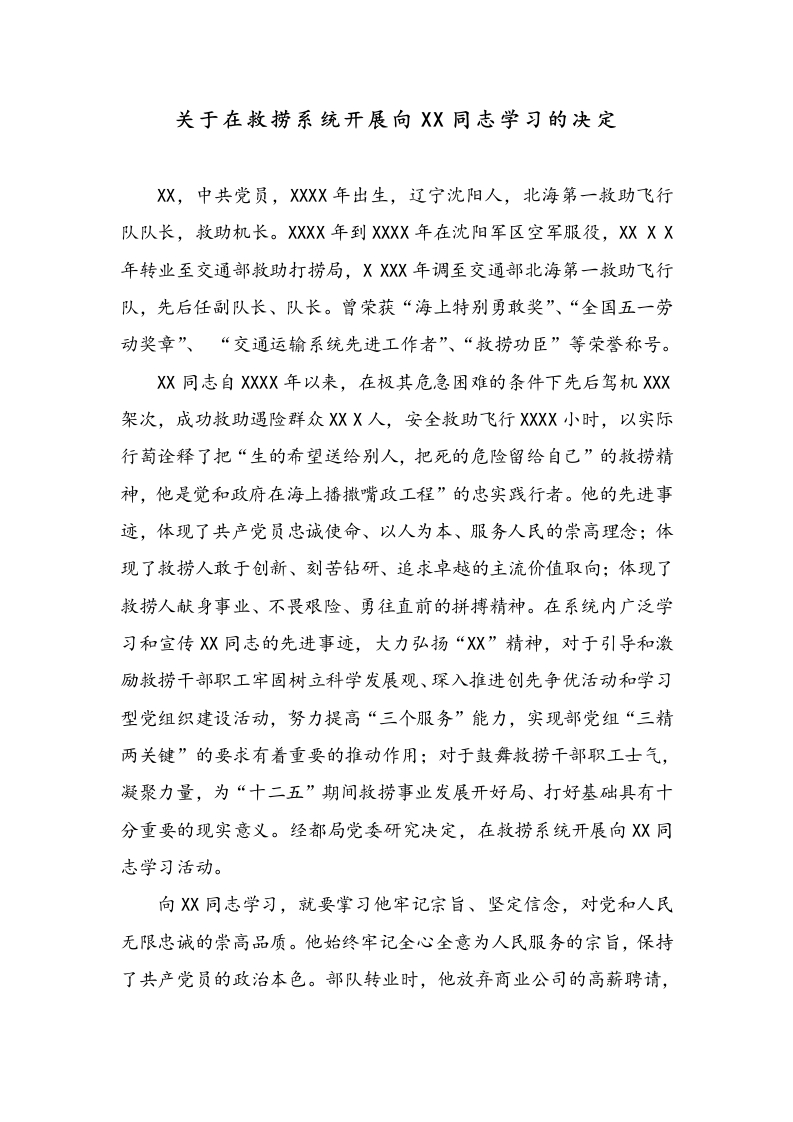 关于在救捞系统开展向XX同志学习的决定X,中共党员,XXX年出生,辽宁沈阳人,北海第一救助飞行队队长,救助机长。XXX年到XXX年在沈阳军区空军服役,XXX年转业至交通部救助打捞局,XXX年调至交通部北海第一救助飞行队,先后任副队长、队长。曾荣获“海上特别勇敢奖”、“全国五一劳动奖章”、“交通运输系统先进工作者”、“救捞功臣”等荣誉称号。X同志自XXX年以来,在极其危急困难的条件下先后驾机XX架次,成功救助遇险群众XX人,安全救助飞行XXX小时,以实际行萄诠释了把“生的希望送给别人,把死的危险留给自己”的救捞精神,他是觉和政府在海上播撒嘴政工程”的忠实践行者。他的先进事迹,体现了共产党员忠诚使命、以人为本、服务人民的崇高理念:体现了救捞人敢于创新、刻苦钻研、追求卓越的主流价值取向:体现了救捞人献身事业、不畏艰险、勇往直前的拼搏精神。在系统内广泛学习和宣传X同志的先进事迹,大力弘扬“X”精神,对于引导和激励救捞干部职工牢固树立科学发展观、琛入推进创先争优活动和学习型党组织建设活动,努力提高“三个服务”能力,实现部党组“三精两关键”的要求有着重要的推动作用:对于鼓舞救捞干部职工士气,凝聚力量,为“十二五”期间救捞事业发展开好局、打好基础具有十分重要的现实意义。经都局党委研究决定,在救捞系统开展向X同志学习活动。向X同志学习,就要掌习他牢记宗旨、坚定信念,对党和人民无限忠诫的崇高品质。他始终牢记全心全意为人民服务的宗旨,保持了共产党员的政治本色。部队转业时,他放弃商业公司的高薪聘请,投身救捞事业。放弃全家团聚北京的大城市生活,主动要求到一线承担危险的救助任务。作为救助飞行员,他忠实地履行着共产党员的责任和义务,严格要求亩己,吃苦耐劳,兢兢业业,平均每年值班待命XX多天,克服酷暑严寒和直升机巨大噪音,出色地完成了各项救助和国家重点工程及国家重大突发事件的应急救援保障任务。作为飞行救助专家和飞行队队长,他心系事业,积极参与北部海域飞行救助基地的选址和建设工作,努力探索飞行救援的新模式,新机制,建立了X个飞行救助基地和X个临时起降点,初步形成了渤海湾地区陆岛空中救援网络,提高了直升机救助教能,扩大了直升机救助范围,拓展了直升机救助功能。目前,这一模式已在东部和南部海区推广,并取得了重大成效,发挥了重要作用。向X同志学习,就要学习他苦练技术、勇于创新,耐救助事业充瞒热爱的优秀品格。他废寝忘食、孜孜不倦,努力自学专业英语、民航法规和业务知识,以最快的速度通过了相关的业务理论考核,并取得了优异成绩,在飞行训练上,他全心投入,虚心请教,刻苦训练救助实操技术,先后取得了美国西科斯墓S-XX机型教员机长资格证书和欧洲直升机公司ECXXX机型机长资格证书,为完成飞行救助任务打下了坚实的技术基础。他主动作为,敢于创新,积极探索夜间海上援救、直升机城市救援、山地救援和高速公路救援等新课题、新技术,并付诸救助实践,先后成功完成了威海嗟山救助和淄博电厂救助等山地救援和城市救援任务。XXX年X月,首次成功机降印度货轮,救起重伤外籍船员、XXX年,在烟台市组织的客滚船海上应急救援演习中成功机降烟台山医院急救中心楼顶平台,受到现场观摩演习的日本和韩国救助专家的高度评价。