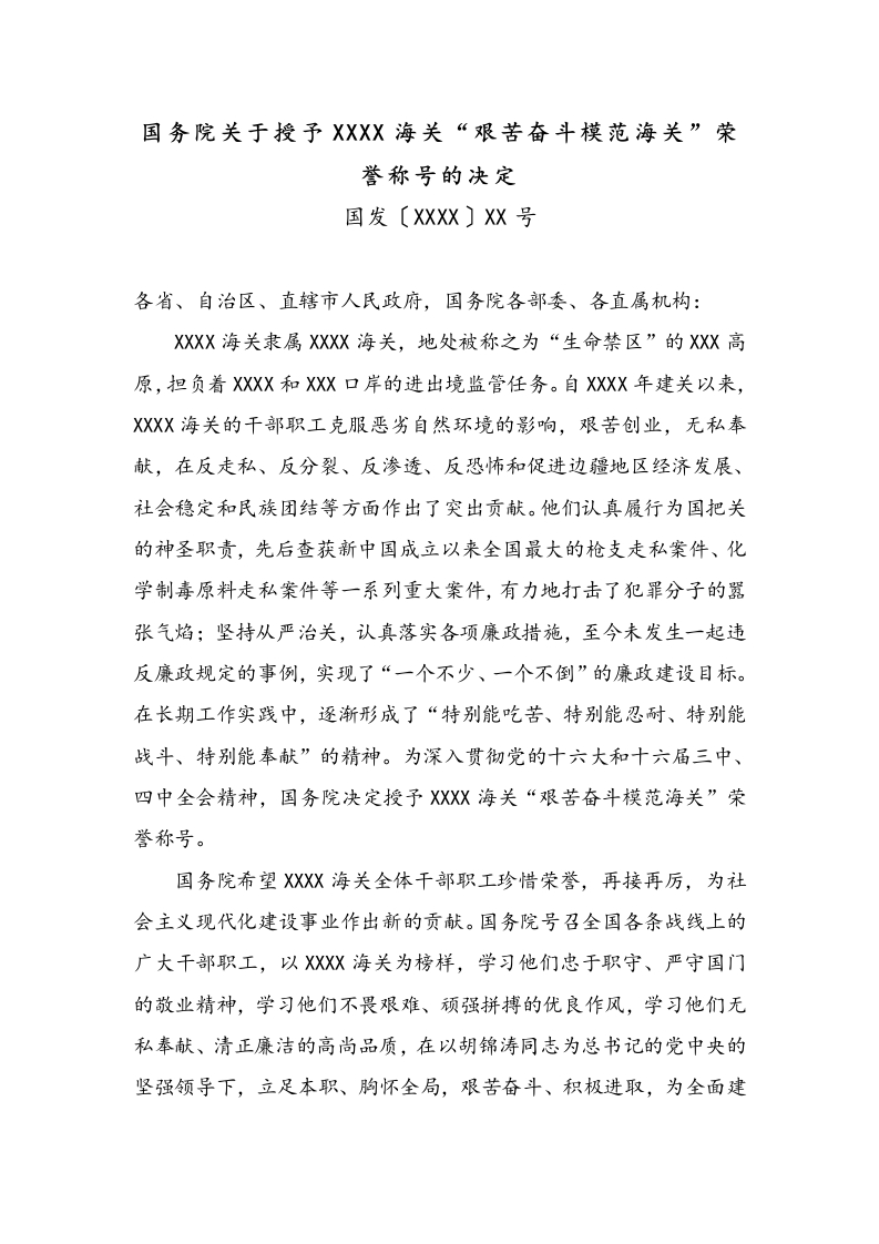 国务院关于授予XXXX海关“艰苦奋斗模范海关”荣誉称号的决定各省、自治区、直辖市人民政府,国务院各部委、各直属机构:XXXX海关隶属XXX海关,地处被称之为“生命禁区”的XX高原,担负着XXX和XX口岸的进出境监管任务。自XXXX年建关以来,XXX海关的千部职工克服恶劣自然环境的影响,艰苦创业,无私奉献,在反走私、反分裂、反渗透、反恐怖和促进边疆地区经济发展、社会稳定和民族团结等方面作出了突出贡献。他们认真履行为国把关的神圣职责,先后查获新中国成立以来全国最大的枪支走私案件、化学制毒原料走私案件等一系列重大案件,有力地打击了犯罪分子的嚣张气焰:坚持从严治关,认真落实各项廉政措施,至今未发生一起违反廉政规定的事例,实现了“一个不少、一个不倒”的廉政建设目标。在长期工作实践中,逐渐形成了“特别能吃苦、特别能忍耐、特别能战斗、特别能奉献”的精神。为深入贯彻党的十六大和十六届三中、四中全会精神,国务院决定授予XXX海关“艰苦奋斗模范海关”荣誉称号。国务院希望XXX海关全体干部职工珍惜荣誉,再接再厉,为社会主义现代化建设事业作出新的贡献。国务院号召全国各条战线上的广大干部职工,以XXX海关为榜样,学习他们忠于职守、严守国门的敬业精神,学习他们不畏艰难、顽强拼搏的优良作风,学习他们无私奉献、清正廉洁的高尚品质,在以胡锦涛同志为总书记的党中央的坚强领导下,立足本职、胸怀全局,艰苦奋斗、积极进取,为全面建设小康社会和构建社会主义和谐社会而努力奋斗。国务院XXXX年X月X日免责声明:图文来源网络征集,版权归原作者所有。若侵犯了您的合法权益,请作者持权属证明与本站联系,我们将及时更正、副除!谢谢!