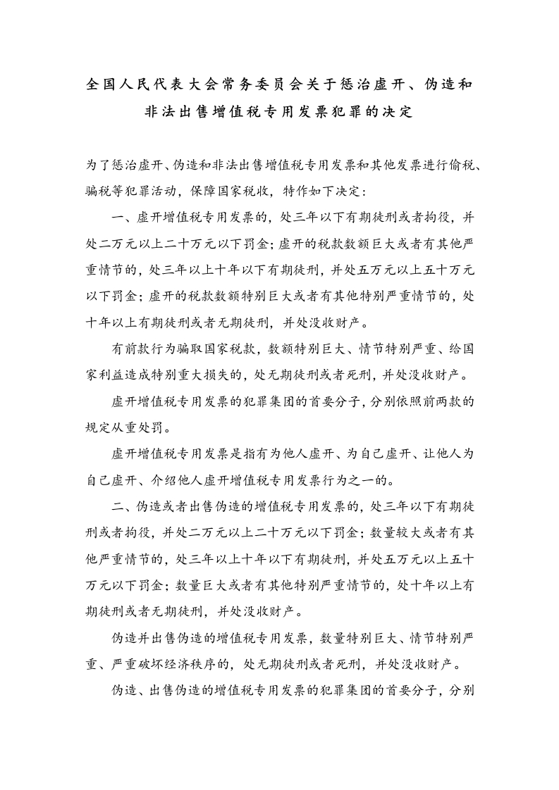 全国人民代表大会常务委员会关于惩治虚开、伪造和非法出售增值税专用发票犯罪的决定为了惩治虚开、伪造和非法出售增值税专用发票和其他发票进行偷税、骗税等犯罪活动,保障国家税收,特作如下决定:一、虚开增值税专用发票的,处三年以下有期徒刑或者拘役,并处二万元以上二十万元以下罚金:虚开的税款数额巨大或者有其他严重情节的,处三年以上十年以下有期徒刑,并处五万元以上五十万元以下罚金:虚开的税款数额特别巨大或者有其他特别严重情节的,处十年以上有期徒刑或者无期徒刑,并处没收财产。有前款行为骗取国家税款,数额特别巨大、情节特别严重、给国家利益造成特别重大损失的,处无期徒刑或者死刑,并处没收财产。虚开增值税专用发票的犯罪集团的首要分子,分别依照前两款的规定从重处罚。虚开增值税专用发票是指有为他人虚开、为自己虚开、让他人为自己虚开、介绍他人虚开增值税专用发票行为之一的。二、伪造或者出售伪造的增值税专用发票的,处三年以下有期徒刑或者拘役,并处二万元以上二十万元以下罚金:数量较大或者有其他严重情节的,处三年以上十年以下有期徒刑,并处五万元以上五十万元以下罚金:数量巨大或者有其他特别严重情节的,处十年以上有期徒刑或者无期徒刑,并处没收财产。伪造并出售伪造的增值税专用发票,数量特别巨大、情节特别严重、严重破坏经济秩序的,处无期徒刑或者死刑,并处没收财产。伪造、出售伪造的增值税专用发票的犯罪集团的首要分子,分别依照前两款的规定从重处罚。三、非法出售增值税专用发票的,处三年以下有期徒刑或者拘役,并处二万元以上二十万元以下罚金:数量较大的,处三年以上十年以下有期徒刑,并处五万元以上五十万元以下罚金;数量巨大的,处十年以上有期徒刑或者无期徒刑,并处没收财产。四、非法购买增值税专用发票或者伪造的增值税专用发票的,处五年以下有期徒刑、拘役,并处或者单处二万元以上二十万元以下罚金。购买增值税专用发票或者伪造的增值税专用发票又虚开或者出售的,分别依照第一条、第二条、第三条的规定处罚。五、虚开用于骗取出口退税、抵扣税款的其他发票的,依照本决定第一条的规定处罚。虚开用于骗取出口退税、抵扣税款的其他发票是指有为他人虚开、为自己虚开、让他人为自己虚开、介绍他人虚开用于骗取出口退税、抵扣税款的其他发票行为之一的。六、伪造、擅自制造或者出售伪造、擅自制造的可以用于骗取出口退税、抵扣税款的其他发票的,处三年以下有期徒刑或者拘役,并处二万元以上二十万元以下罚金:数量巨大的,处三年以上七年以下有期徒刑,并处五万元以上五十万元以下罚金:数量特别巨大的,处七年以上有期徒刑,并处没收财产。伪造、擅自制造或者出售伪造、擅自制造的前款规定以外的其他发票的,比照刑法以第一百二十四条的规定处罚。非法出售可以用于骗取出口退税、抵扣税款的其他发票的,依照第一款的规定处罚。