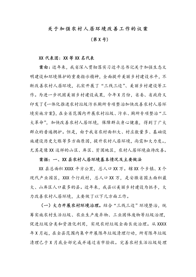 关于加强农村人居环境改善工作的议案(第X号)案由:近年来,我省深入贯彻落实习近平总书记关于加强生态文明建设和环境保护的重要指示精神,全面提升美丽乡村建设水平,不断改善农村人居环境,扎实开展了“三线三边”、美丽乡村建设等工作。为进一步巩固美丽乡村建设成果,今年X月份,省委、省政府又印发了《一体化推进农村垃圾污水厕所专项整治加快政善农村人居环境实施方案》,在全省范围内开展农村垃圾、污水、厕所专项整治“三大革命”,加快改善农村人居环境,保障群众身心健康,得到了广大群众的普遍拥护。但是,由于我省农村面积大、村庄数量多、基础设施建设历史欠账等多方面原因,提升农村人居环境,尚需加大力度。,尤其是像X这样的山区、库区、贫困地区,农村人居环境亟待改善。案据:一、X县农村人居环境基本情况及主要做法x县总面积XXX平方公里,总人口X万。辖X个乡镇、X个现代产业园区,XX个行政村,总人口X万,是安徽省国土面积最大、山库区人口最多的县。近年来,我县以美丽乡村建设为抓手,大力改善农村人居环境,主要做了以下几方面工作。(一)大力开展农村环境治理。结合“三线三边”环境整治,统筹实施农村生活垃圾、农业生产废弃物、工业固体废物等垃圾治理,促进垃圾分类和资源化利用,实现农村垃圾全面长效治理。从XXX年X月起,在全县范围内集中开展陈年垃圾清理行动,所有陈年垃圾清理已于X月底全部完成并通过省市验收。完善农村生活垃圾处理“村组收集、乡镇集中、县运输处理”的三级联动机制,严禁露天焚烧垃圾,全部取缔二次污染严重的集中堆放、简易填埋以及小型焚烧炉等。(二)积极推进农村生活污水治理。XXX年,在古碑镇、南溪镇新建日处理能力XXX吨的污水处理设施各一座,在汤家汇镇、双河镇新建日处理能力XX吨、XX吨的污水处理设施各一座;投资XXX万元,完成X个重点贫困村、XX个扶贫搬迁点污水处理设施建设:投资XXX万元,实施X个美丽乡村中心村庄以污水处理为主的综合整治项目。力争XXX年实现乡镇集镇污水处理设施实现全覆盖,乡镇集镇污水处理率达X%以上,中心村庄及扶贫搬迁,点污水处理率达XX%以上。(三)稳步实施农村厕所改造。按照省里总体部署要求,根据县情实际,科学制定我县农村厕所改造方案,明确分年度任务和时间节点安排,建立工作台账。按照“统一采购、统一施工、统一验收”的原则,采取“一次性招标,分年度实施”的办法,县政府统一组织实施改厕。按照市场化运作模式,鼓励企业和个人进行改厕后的检查维修、定期收运、粪渣资源利用等后续工作,形成管收用并重、责权利一致的长效管理机制。(四)大力提升农村居民素质。在中心村庄全面开展志愿服务活动,关爱农村留守妇女、留守儿童、留守老人、强化农村未成年人德育;建立健全村规民约,深入开展“十星文明户”、“五好家庭”、“文明示范户”、“美好家庭”和“好媳妇、好婆婆”等XX次评比活动。推进新型职业农民培训,组建乡村文体队伍,丰富群众精神文化生活日趋丰富,促进了乡村和谐发展和群众素质的普遍提升。