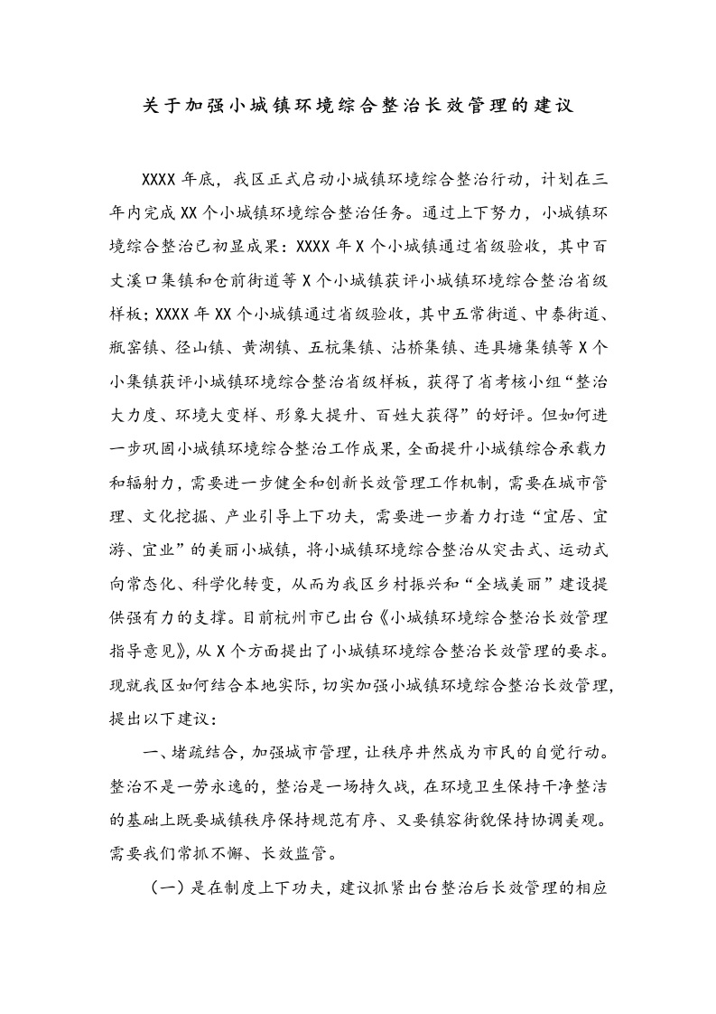 关于加强小城镇环境综合整治长效管理的建议XXX年底,我区正式启动小城镇环境综合整治行动,计划在三年内完成X个小城镇环境综合整治任务。通过上下努力,小城镇环境综合整治已初显成果:XXX年X个小城镇通过省级验收,其中百丈溪口集镇和仓前街道等X个小城镇获评小城镇环境综合整治省级样板;XXX年X个小城镇通过省级验收,其中五常街道、中泰街道、瓶窑镇、径山镇、黄湖镇、五杭集镇、沾桥集镇、连具塘集镇等X个小集镇获评小城镇环境综合整治省级样板,获得了省考核小组“整治大力度、环境大变样、形象大提升、百姓大获得”的好评。但如何进一步巩固小城镇环境综合整治工作成果,全面提升小城镇综合承载力和辐射力,需要进一步健全和创新长效管理工作机制,需要在城市管理、文化挖掘、产业引导上下功夫,需要进一步着力打造“宜居、宜游、宜业”的美丽小城镇,将小城镇环境综合整治从突击式、运动式向常态化、科学化转变,从而为我区乡村振兴和“全域美丽”建设提供强有力的支撑。目前杭州市已出台《小城镇环境综合整治长效管理指导意见》,从X个方面提出了小城镇环境综合整治长效管理的要求。现就我区如何结合本地实际,切实加强小城镇环境综合整治长效管理,提出以下建议:一、堵疏结合,加强城市管理,让秩序井然成为市民的自觉行动。整治不是一劳永逸的,整治是一场持久战,在环境卫生保持干净整洁的基础上既要城镇秩序保持规范有序、又要镇容街貌保持协调美观。需要我们常抓不懈、长效监管。(一)是在制度上下功夫,建议抓紧出台整治后长效管理的相应办法,建立长效管理的目标任务和对策措施。进一步理顺管理体制,明确管理主体。加强整合资源力量,形成管理合力。特别是要强化要素保障,确保管理实效。(二)是通过制定镇民公约、社区公约、积极宣传等手段和做法改善小城镇的软环境,同时进一步建立和巩固“街长制”、“里长制”的模式,注重培养“原住民”全面参与来更好地解决整治后集镇范围内“回潮”的环境秩序问题。(三)是通过精细化管理和堵疏结合的方式,力求小城镇刚柔并济和内外兼修。以城镇居民生活生产需求为出发点,适时调整城市管理的手段和方式,在严格执法的同时,应下功夫研究疏导措施,对街头秩序进行有效管理并不以简单的堵而禁之,有效净化市容秩序环境。二、深度挖掘,营造特色文化,让小镇文化成为市民共同参与的新风尚。应该坚守住文化的“根”与“魂”,用更美好的小城镇更好地连接起城市和农村。我们应该深挖历史,留住集镇记忆,好的集镇就是要“留得住乡愁、看得见人文、听得到生活”。(一)是要充分挖掘老建筑历史(包括古集市、古河、古桥、古巷等),进一步梳理小城镇原有肌理,充分提取杭派民居和田园村落元素对建筑进行升级改造,留住透着独特韵味的杭派民居,留住江南水乡文化生活。传承老建筑的人文底蕴,通过建设文化小景和小品,建成文化礼堂、文化长廊、历史及人文记录馆等手段来重塑老街记忆、焕发老街青春。(二)是要进一步弘扬传统手工艺和非遗中传承的文化内涵,保护传统手工艺文化,寻求匠心精神,并不断扩充年轻的血液保持延续